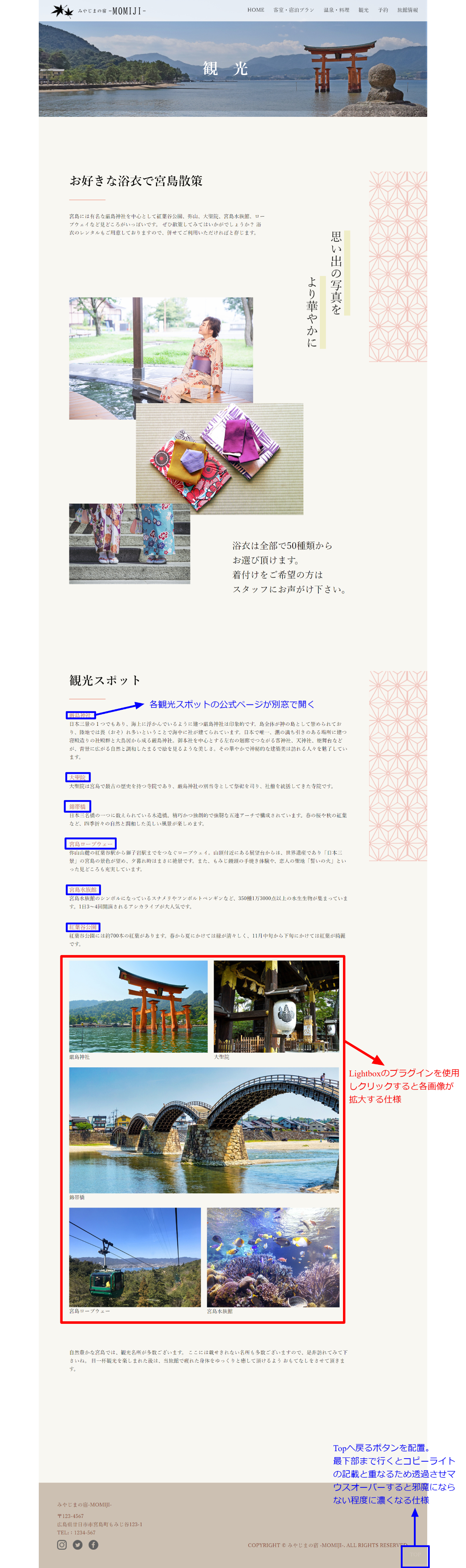 東京都の職業訓練校(早稲田電子IT教育センター)にてグループで制作した作品です。 クライアントを担当する別のグループからの「広島県の宮島にある旅館のウェブサイト」という依頼により制作しました。 生まれて初めてのスクラッチからのコーディングでのサイト制作となりました。