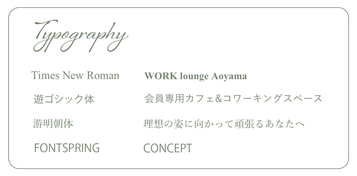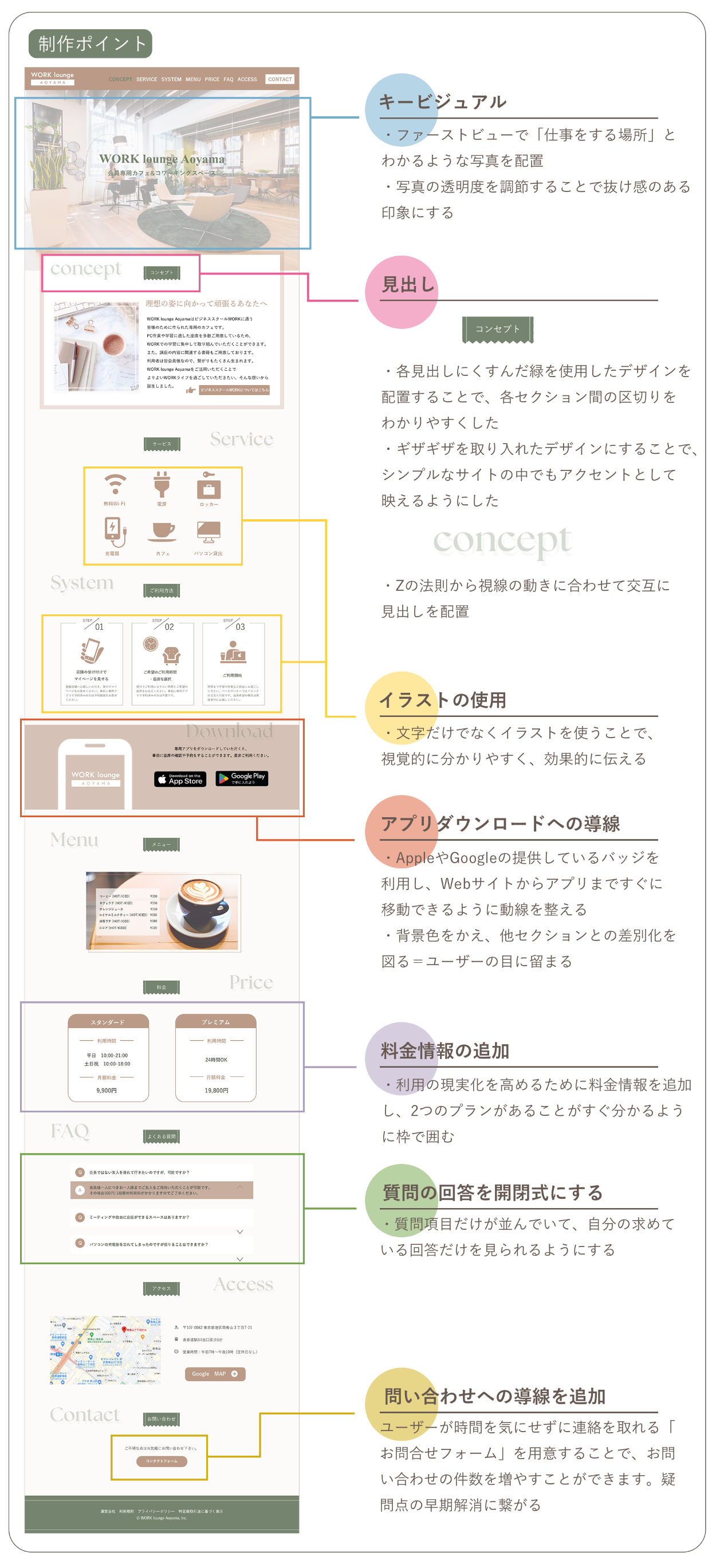 ・デザインに入る前の段階に、ターゲットに何を訴求したいか整理をし、適したデザインを考えたり調べたりすることにとても時間がかかりました。振り返りをした際に、この前段階の作業が基礎・前提となる部分だと感じ、デザインカンプを作成していく中でとても大切になる工程だと思いました。デザインをしていく中でも、基礎情報のクライアントのニーズや特徴を常に考えながらデザインを行う事や、デザインのパーツ1つ1つに意味を持たせ、その連鎖が最終的にクライアントの意向を忠実に反映できるデザインに繋がってくると感じました。