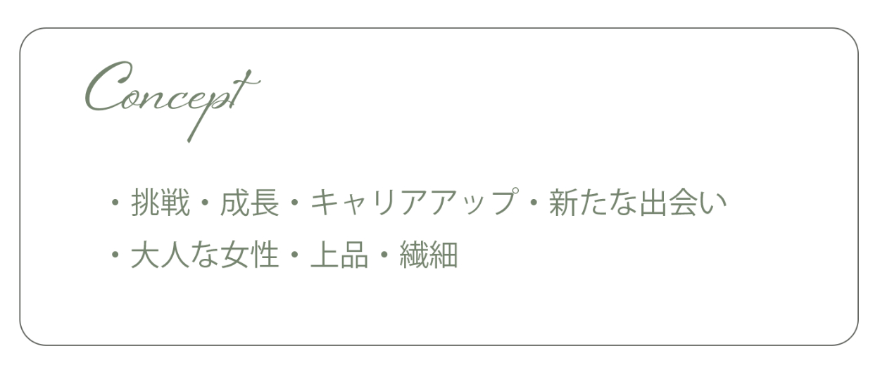 今回のペルソナは「32才の女性」だったので、大人の女性をイメージできる少しくすんだピンクと白をベースにし、アクセントカラーで緑を選び、女性の中でも”大人”らしさを表現できるような配色にしました。デザインのパーツについてはシンプルなものを心がけ、文字のフォントや太さ含め、全体的に繊細で上品なイメージを持てるように各要素の配置、作成を意識しました。