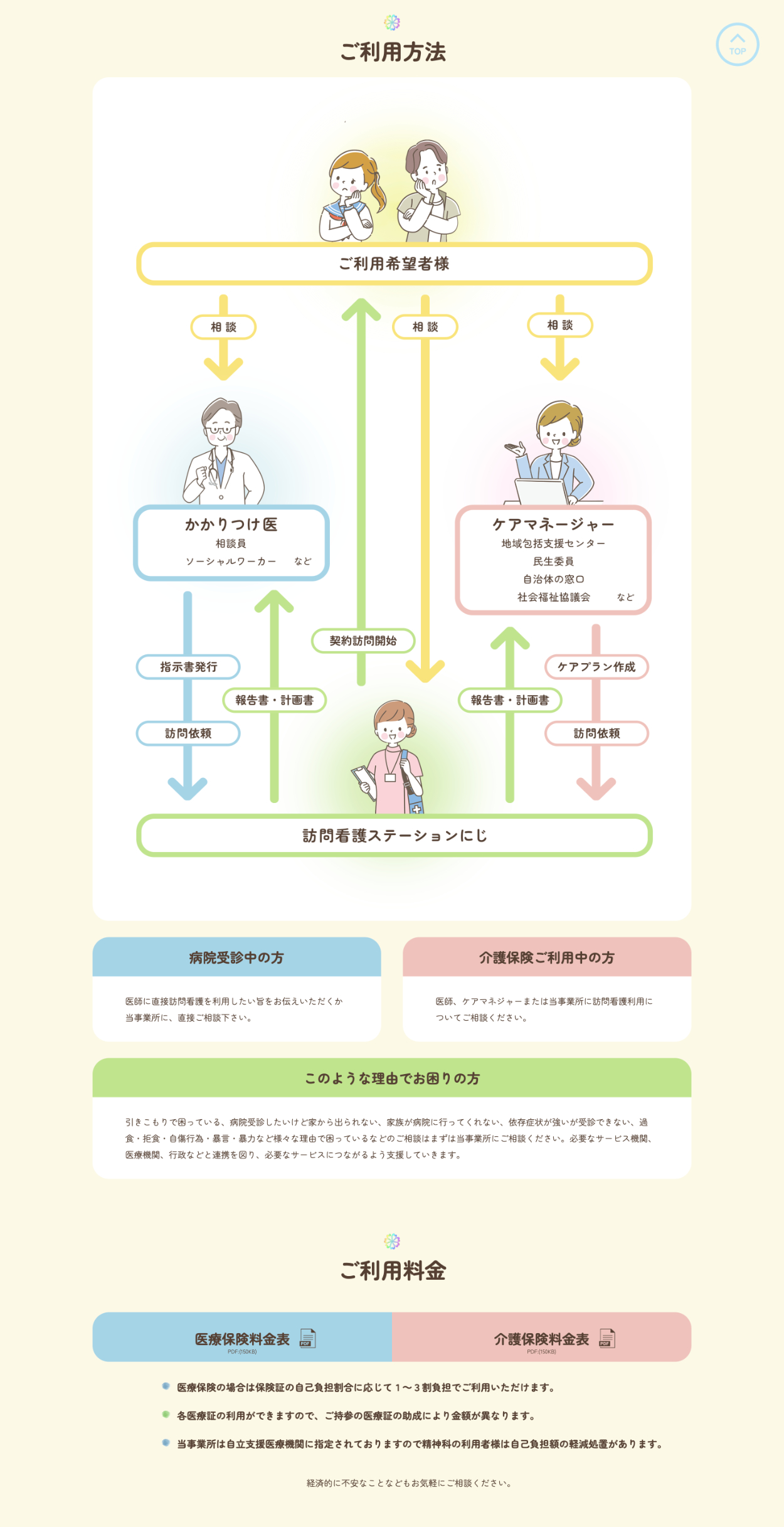 ご利用方法フロー表は、イラスト及び色分けで流れがわかりやすくなるようにしました。ページを見ている人が自分が知りたい情報を探さなくても良いよう、配置と色で規則性を持たせました。