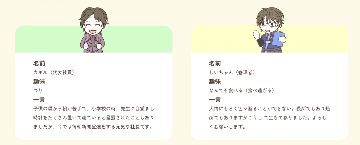 他ページとの統一感を出すため、ボックス形式にしました。可愛い雰囲気をご希望でしたので、ボックスからイラストを飛び出すように配置しました。スタッフそれぞれにテーマカラーがあると伺ったので、サイトデザインに合うようにパステル系のトーンに統一しました。(イラストお客様提供)テキスト部分は変更できる形式になっており、白背景の高さを揃えるため、文字制限を75文字に設定するよう管理画面担当メンバーに依頼しました。