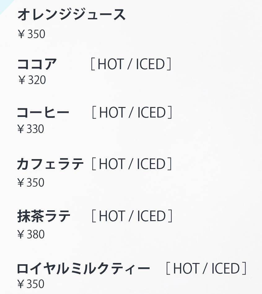 文字が多いセクションではありますが、ドリンク名と価格のフォントサイズに差をつけて視覚的に分かりやすくしました。