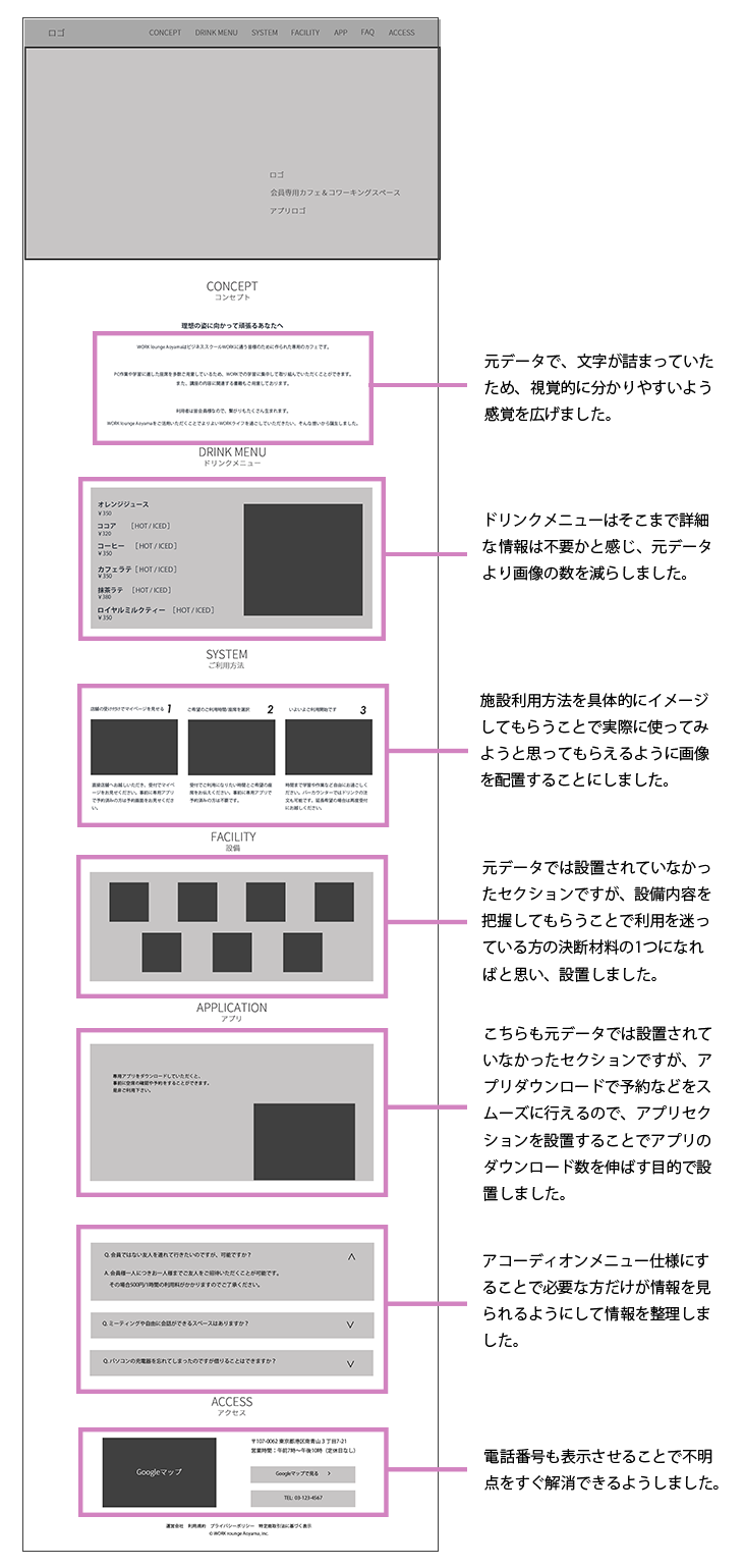 SHElikes MULTI CREATOR PROJECTの課題で、会員様限定のカフェ&コワーキングスペースのLP制作に取組みました。クライアントからの要件書とワイヤーフレームを元に、PCのデザインカンプとSPのワイヤーフレームを制作しました。