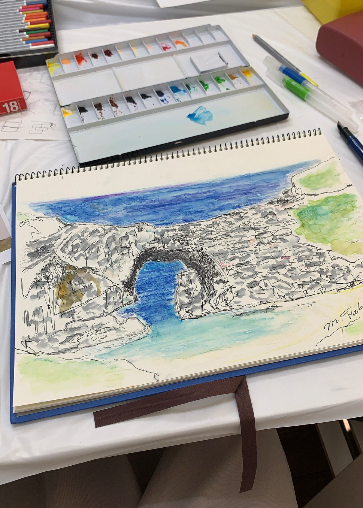 水彩画/Travel Mai Takaoka ペンと水彩を組み合わせた風景スケッチです。構図と質感のバランスを意識し、岩場の複雑な形や海の奥行きを、簡潔な線と色で旅の思い出を素早く仕上げ残しました。使用ツール:水彩絵具、ボールペン