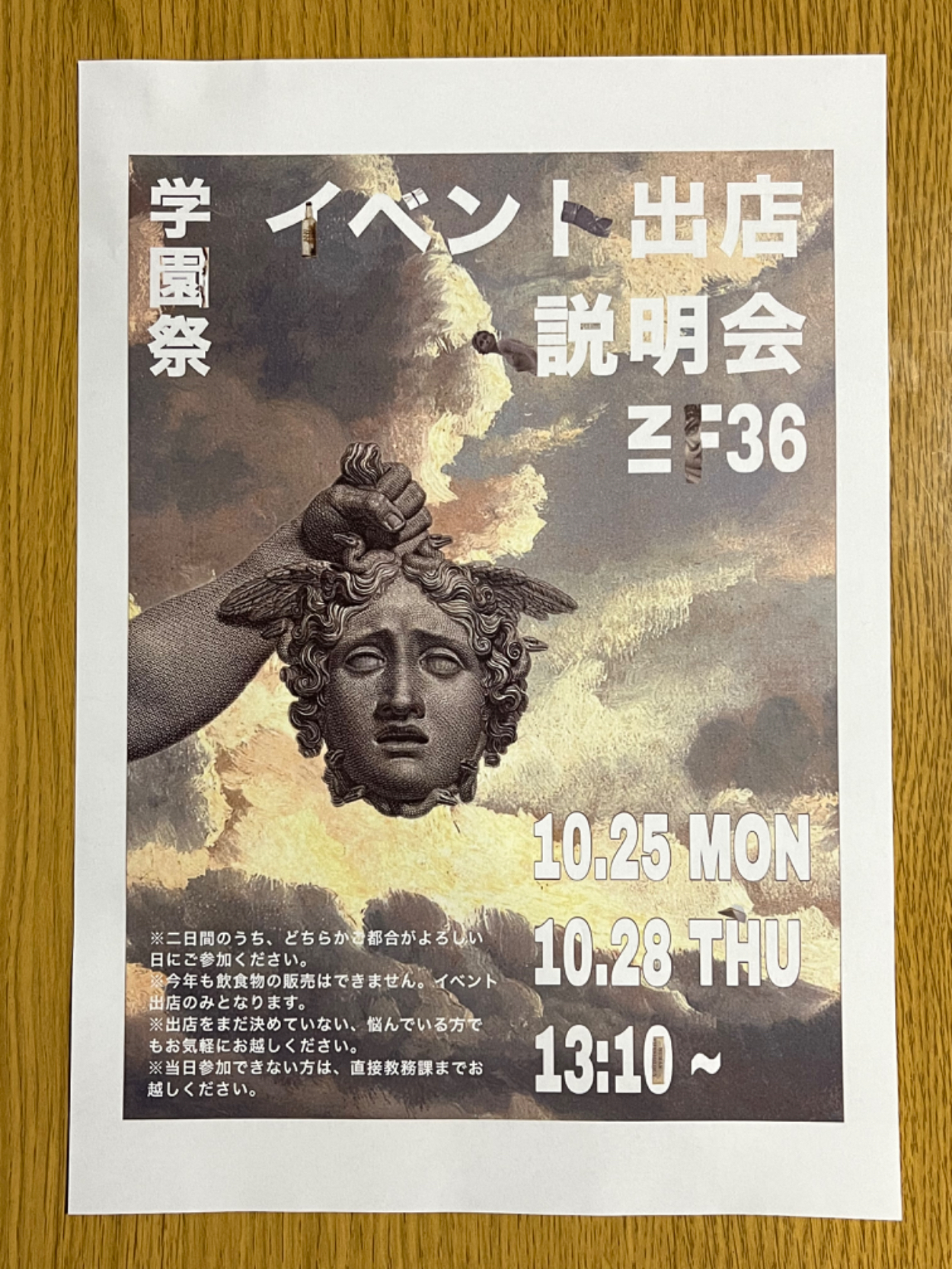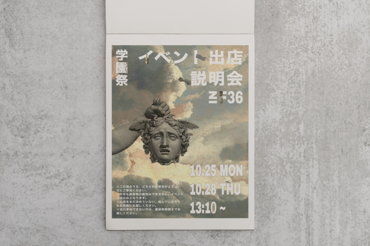 美術館にある『〇〇大博覧会』『〇〇展』のようなポスターはインパクトが強くつい見入ってしまった記憶があります。なので、そのようなイメージで制作を進めていくことにしました。題名(イベント出店説明会の部分)や時間、場所など大事な情報は文字のサイズを大きめに、目立つように配置し、そうではないちょっとした注意書きは普通のサイズで配置しました。中央にある石像が目立つように、どうしても文字色は白を使いたかったので、実際に印刷して光の反射などの関係で『見にくいな』と感じる部分にはさりげなく文字枠をつけています。背景も細かく明度調整を繰り返しました。