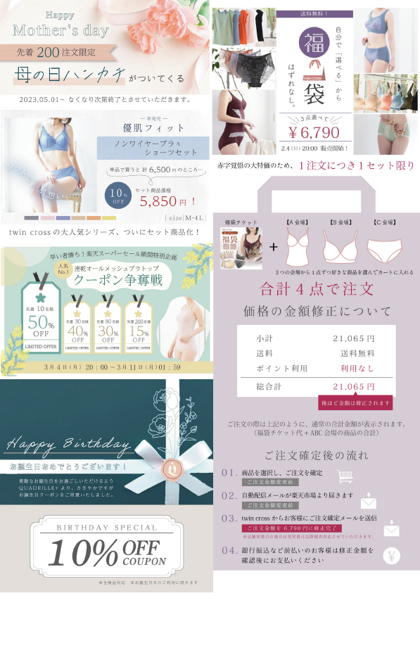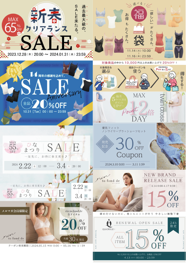 バナー制作 作品集 Rina Sugimoto Webデザイナー/グラフィックデザイナー/イラストレーター OVERVIEW 2023〜 楽天市場やYahoo! JAPAN、ECサイトや広告などで使用されたバナーの作品集です。 アパレル関係や美容系など、女性向けコンテンツの案件が多め。 YEAR 2023 - 2024