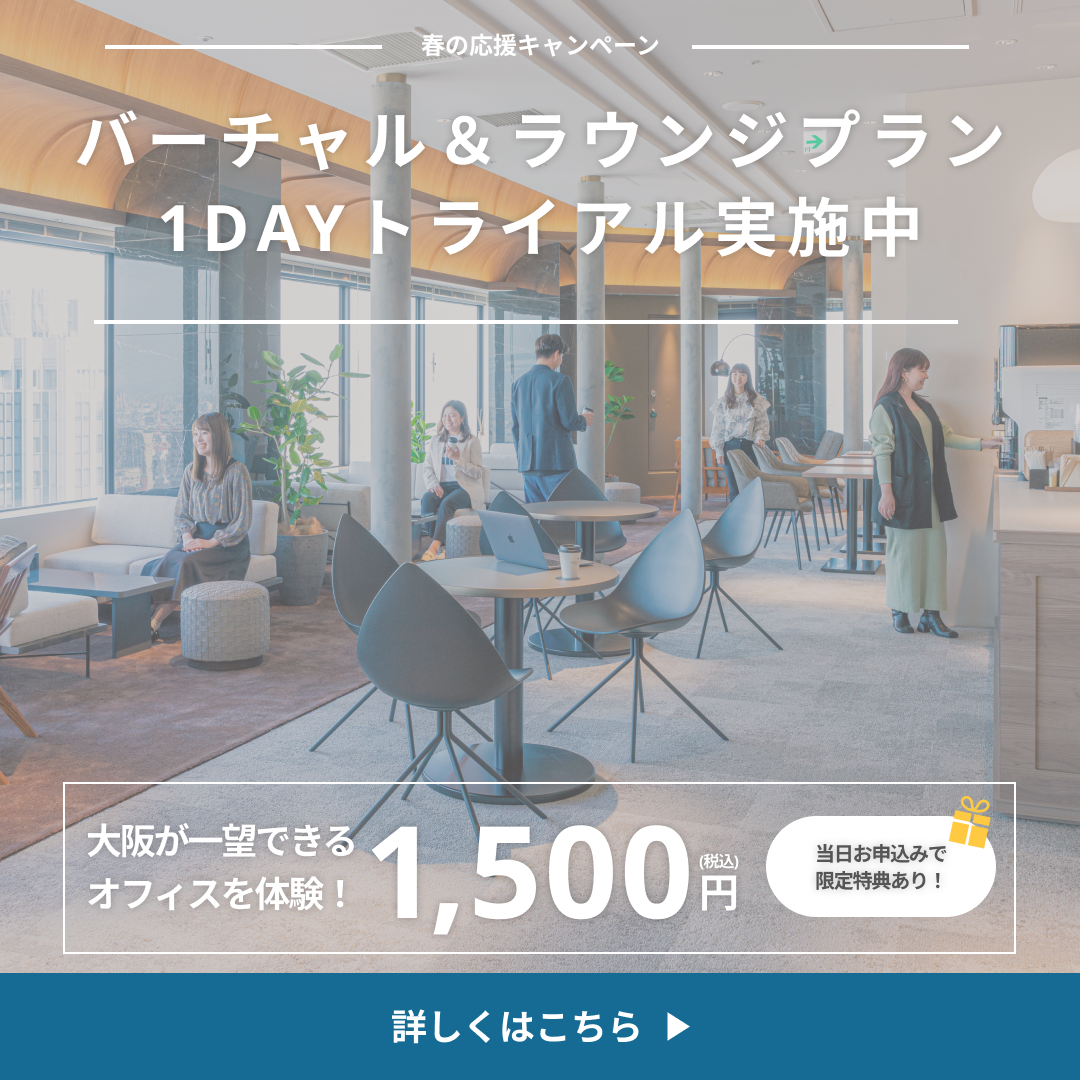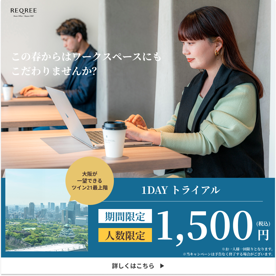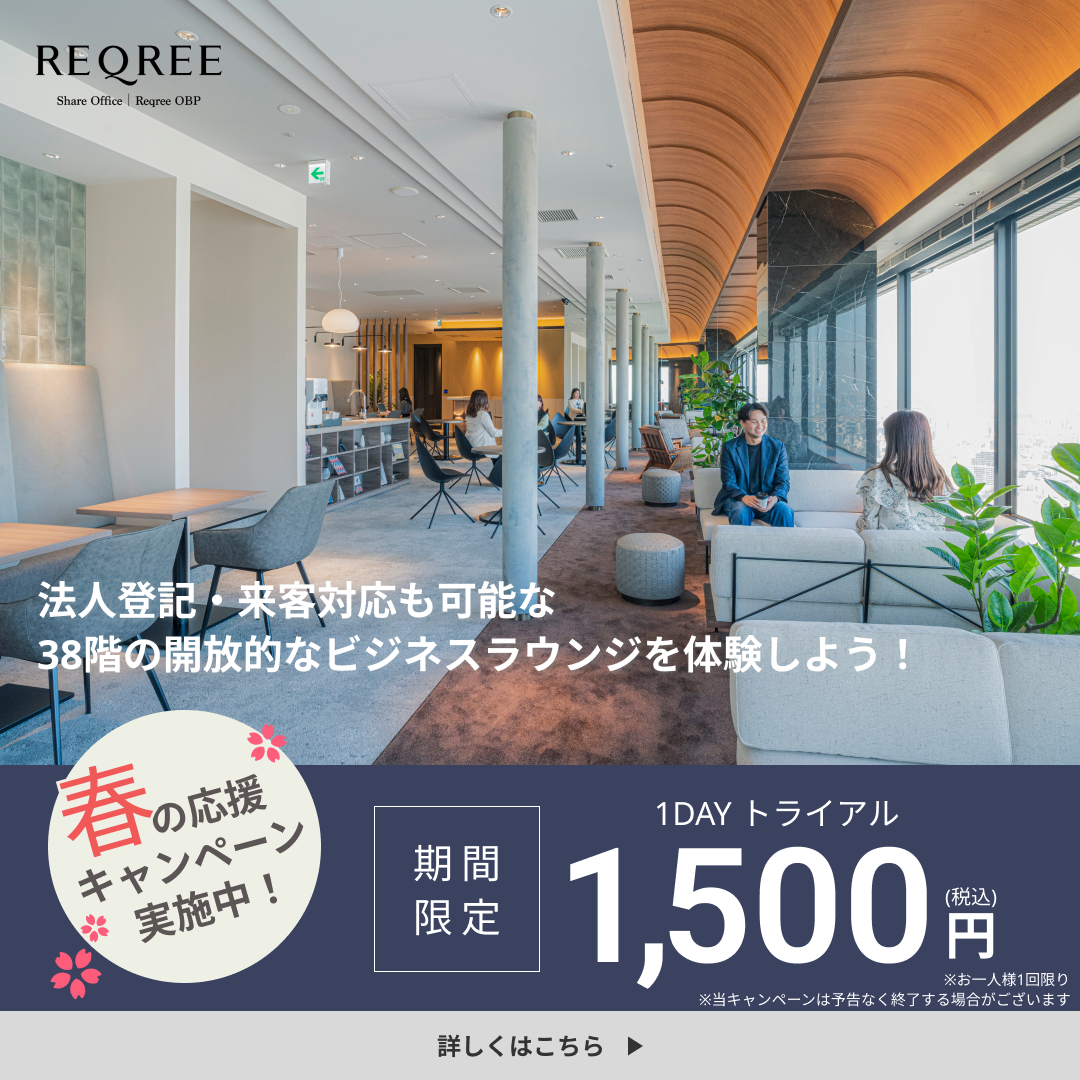 ①カジュアルなフォントで1500円が分かりやすく見えるように配置。春のキャンペーン実施中!と記載の上、期間限定と訴求をして行動に繋がるようにしました。空間全体の写真でOBPの開放的なイメージが伝わり、おしゃれなものが好きな人にもビジュアルで一目見てもらえるように工夫しています。
