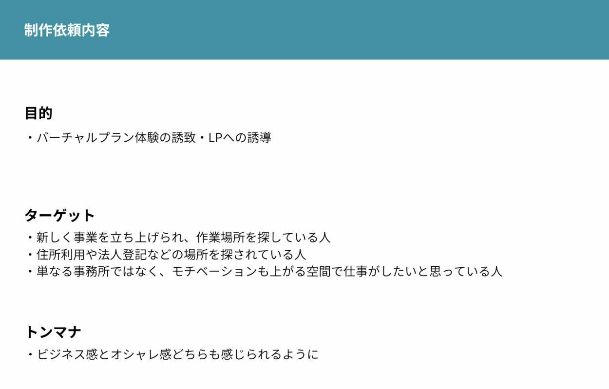 ③色味を抑えて、シンプルさを前面に出しました。パッと見たときにインパクトは少ないかもしれませんが、バーチャルプランと大きく記載し「登記なども可能なオフィスを探している人はバーチャルという言葉も知っている」という仮説のもとで、ターゲット絞ってみました。