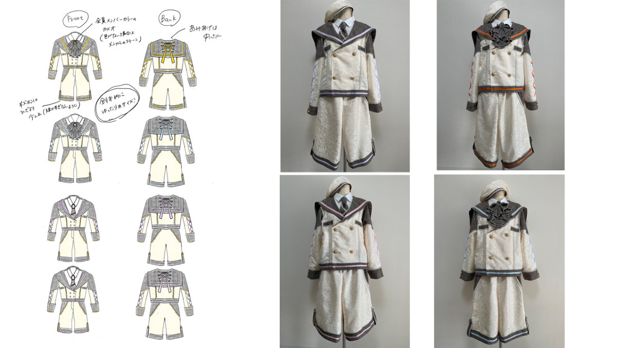 ・シックな雰囲気にするためにリボンはスカーフのような形に、4着ともカメオブローチをつけ、全体的にジャガードを使用しました