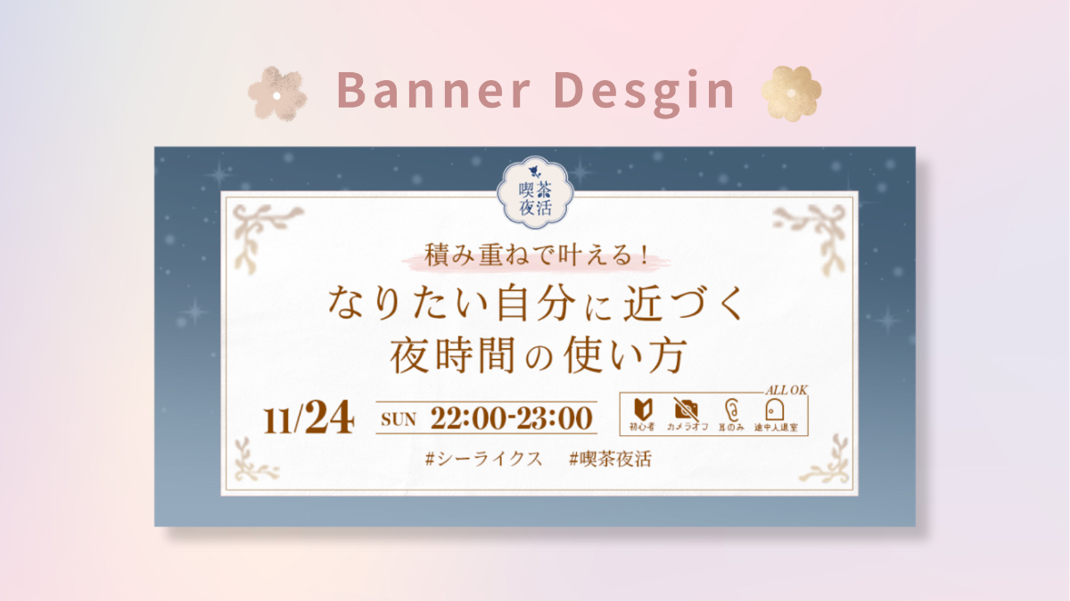 SHElikes内のコミュニティイベントにてイベント内容を告知するバナーを作成しました。 【制作日:2024年11月 / 制作時間:4時間 / 制作期間:1週間 / 使用ツール:Photoshop 】