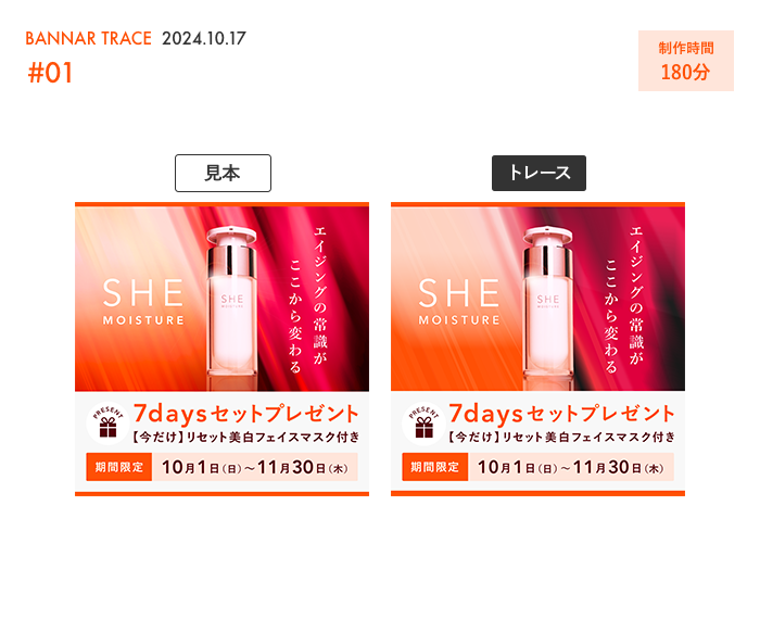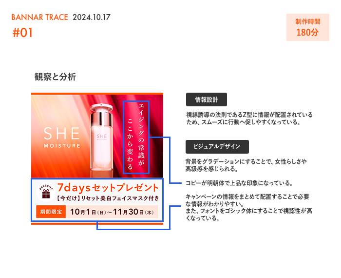 SHElikes MULTI CREATOR COURSEの課題にて、架空のバナーをトレースし、分析と観察した内容をまとめました。 【制作期間】3時間 【使用ツール】Photoshop