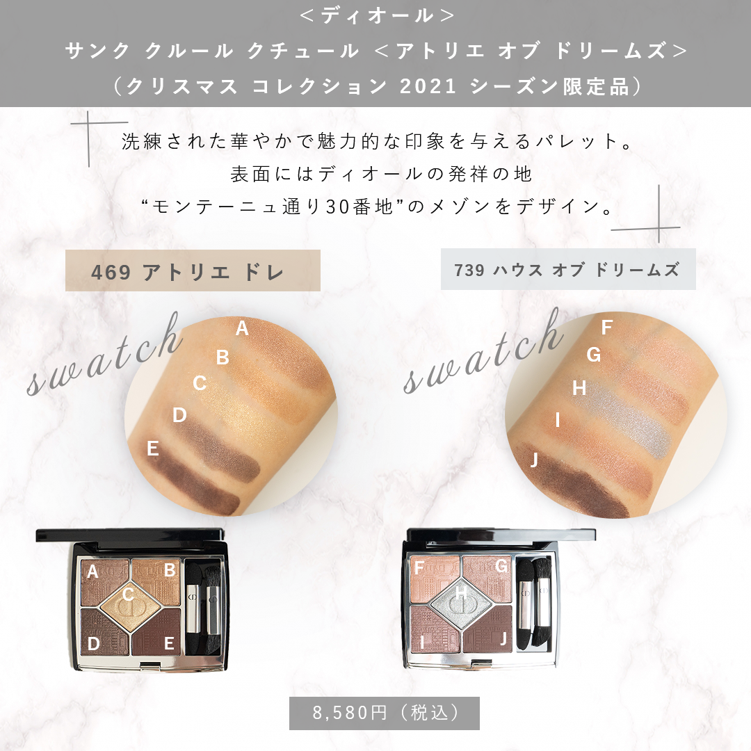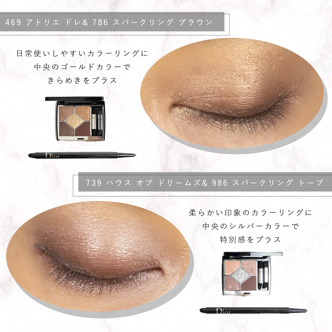 【こだわった点】 ・パッケージが品よく見えるように大理石柄を背景に選びました。 ・色番号、色名称の背景は、コスメのカラーから(アイシャドウは4色のうち1色から)採用しました。 ・コスメの色味が目立つように、グレーと線であしらいをつけて、落ち着いた印象にしました。