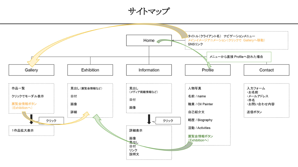ですので、展覧会情報(Exhibition)へのボタンをあえてトップページには配置せず、トップページの次に訪れるであろうGalleryとProfileの下部に展覧会情報(Exhibition)へのボタンを配置しました。
