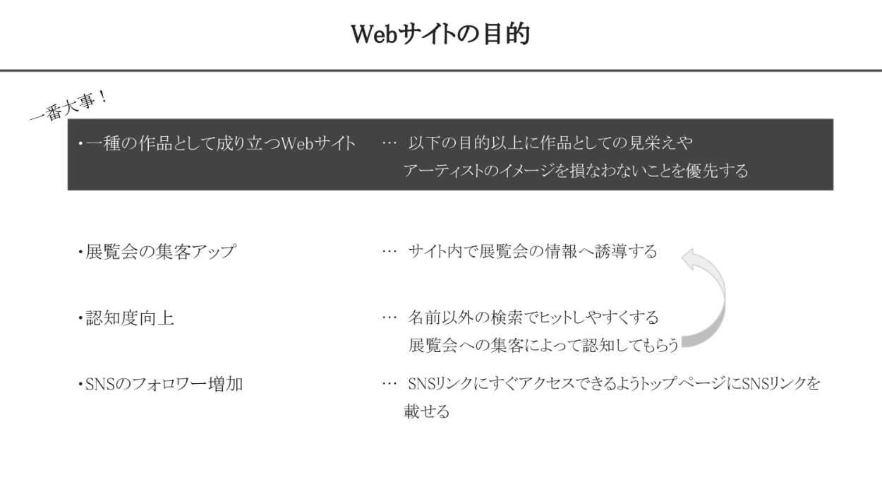 サイトの目的:展覧会の集客アップ、認知度向上、SNSのフォロワー増加、