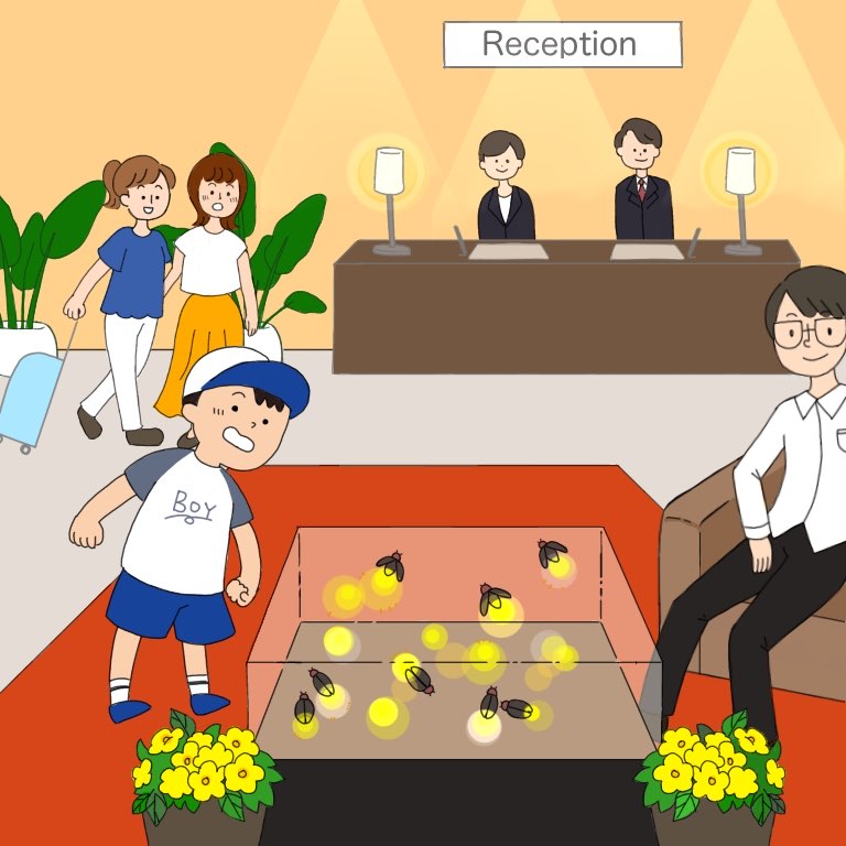 ホテルに到着したばかりの鞄を持った旅客や、ソファでくつろぐ男性、興味深く蛍をみる少年、、、「ホテルの利用客が様々な楽しみ方ができる」様子を表現できるように
