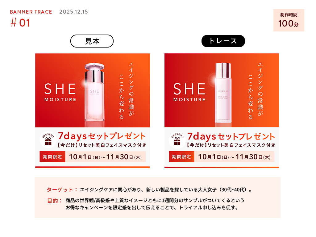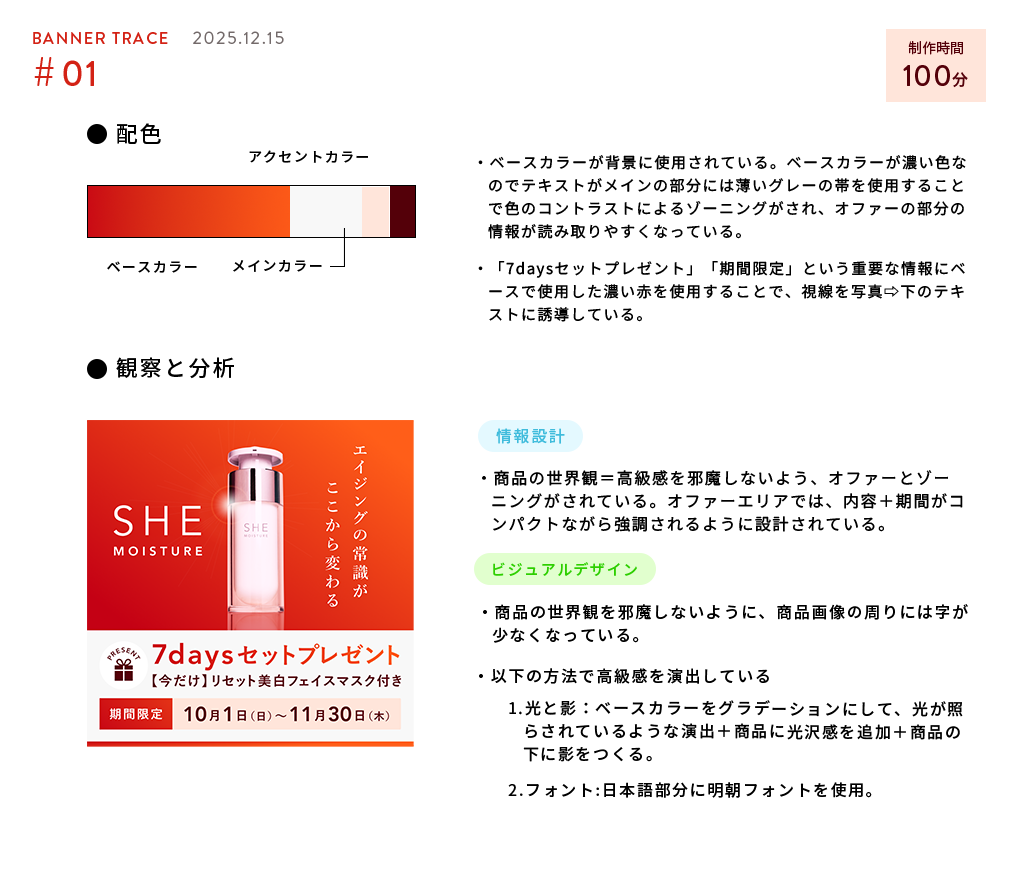 【バナー】エイジングケア美容液バナー Minami’s Portfolio フリーランスクリエイター OVERVIEW エイジングケア美容液バナーのトレース&分析を行いました。 ①制作したバナー②バナーの分析