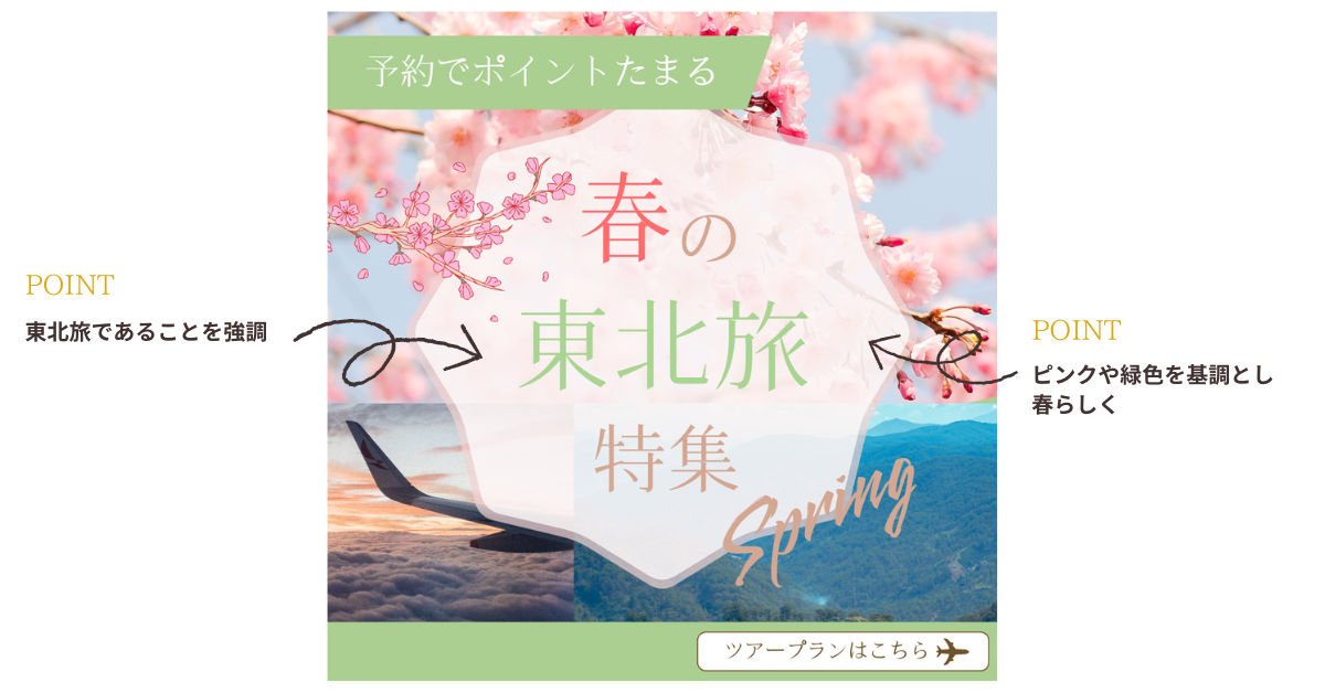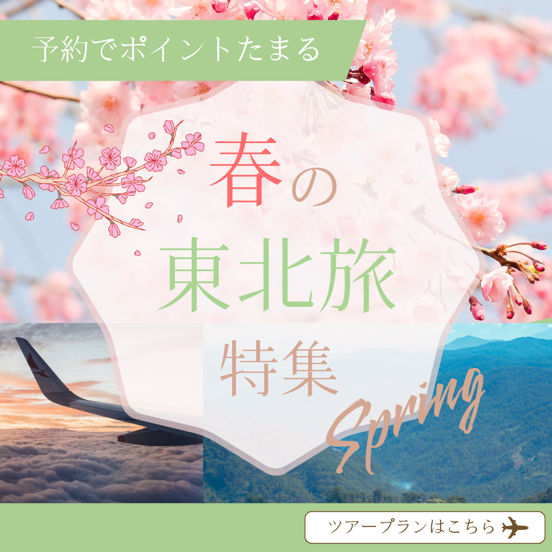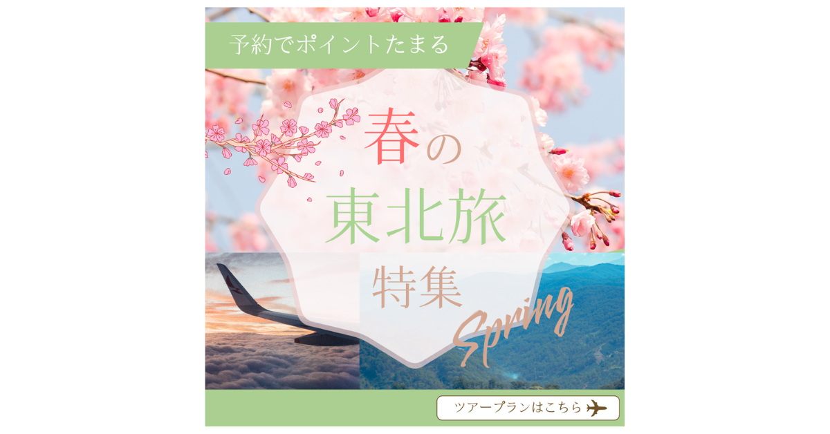 【バナー】東北旅特集 Instagram用広告(架空案件) まえすず webデザイナー 【バナーサイズ】1080✖️1080px【使用ツール】Canva【商品】春の東北旅予約サイトへの誘導バナー【ターゲット】・20代〜40代女性【ポイント】