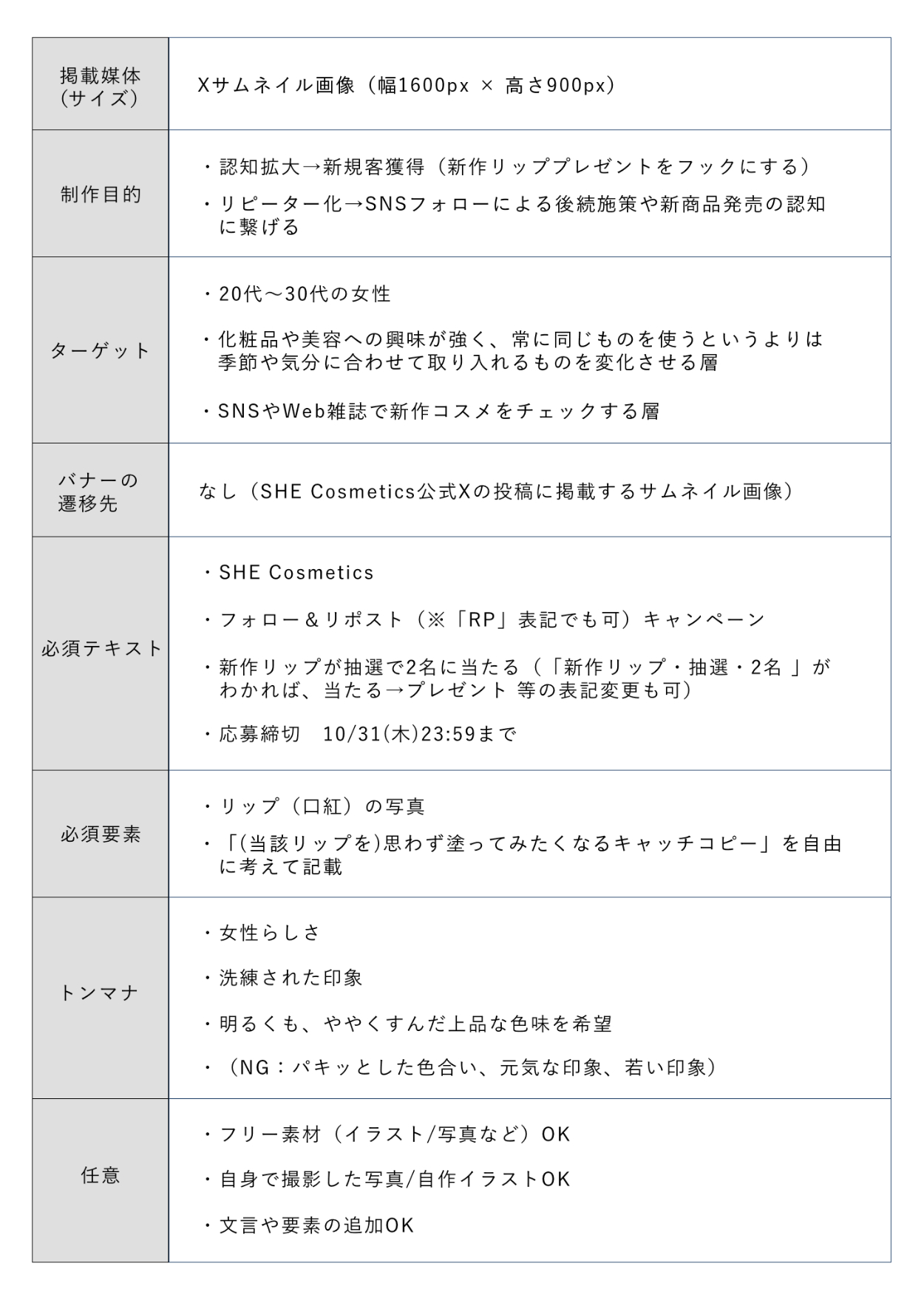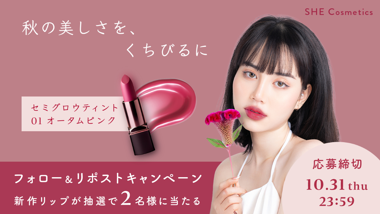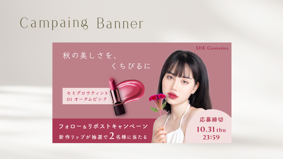 スクール内の自主制作企画にて、新作リップのフォロー&リツイートキャンペーンバナーを作成しました。季節や気分に合わせて取り入れるものを変化させる層がターゲットであったため、秋が見頃である花の色をリップに使用したところがポイントです。