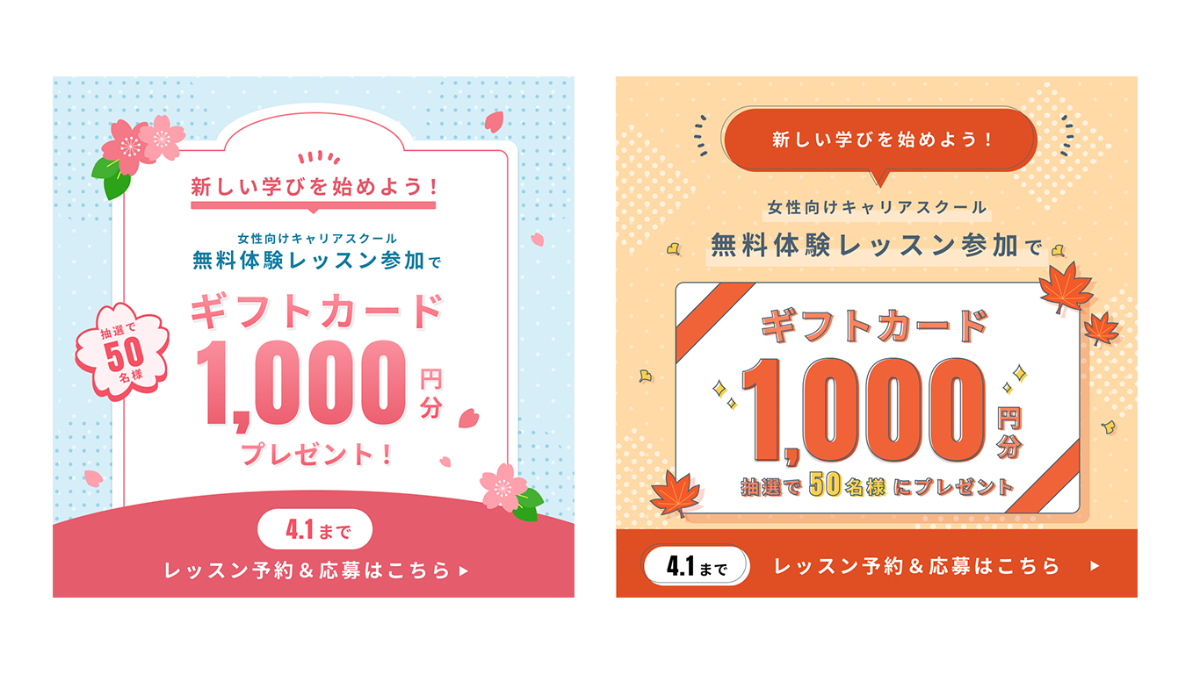 【架空のサービス】バナー制作 fufumi_ OVERVIEW *Figmaコース LESSON2 文字メインのキャンペーンバナー制作(春・秋)ワークより作成 YEAR 2024 ・作成時期:2024/02・使用ツール:figma<春><秋>
