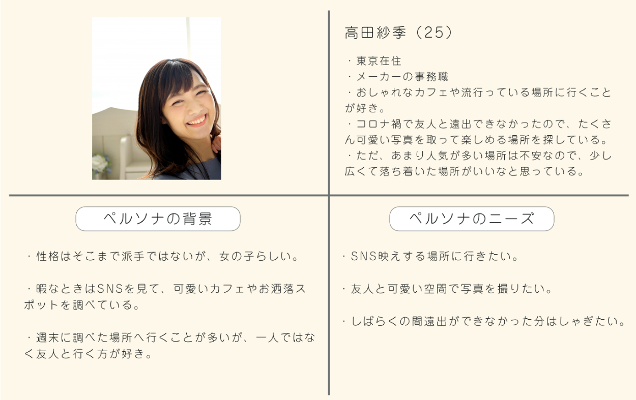 「SNS映えスポットを探している女性の旅行者」をメインターゲットに設定。