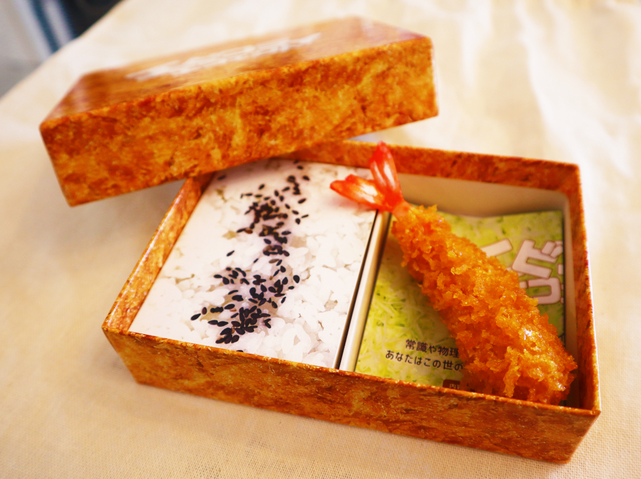 「エビフライエフェクト」の箱の中身は、なんとエビフライ弁当となっている。