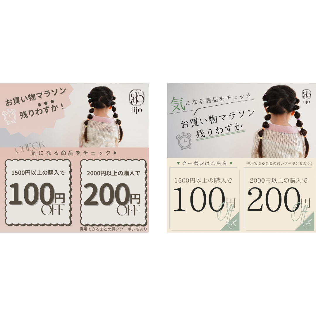 楽天ショップiijo様の商品画像とLINE配信用クーポンバナーの制作をしました。tool:Canva