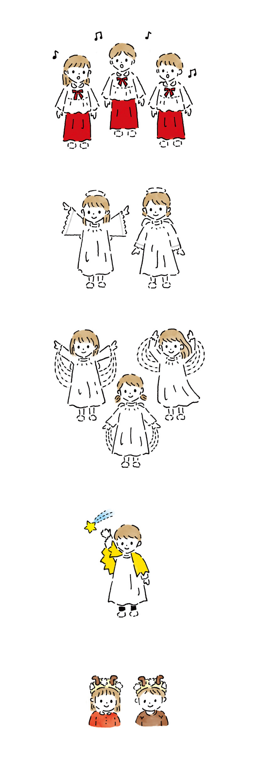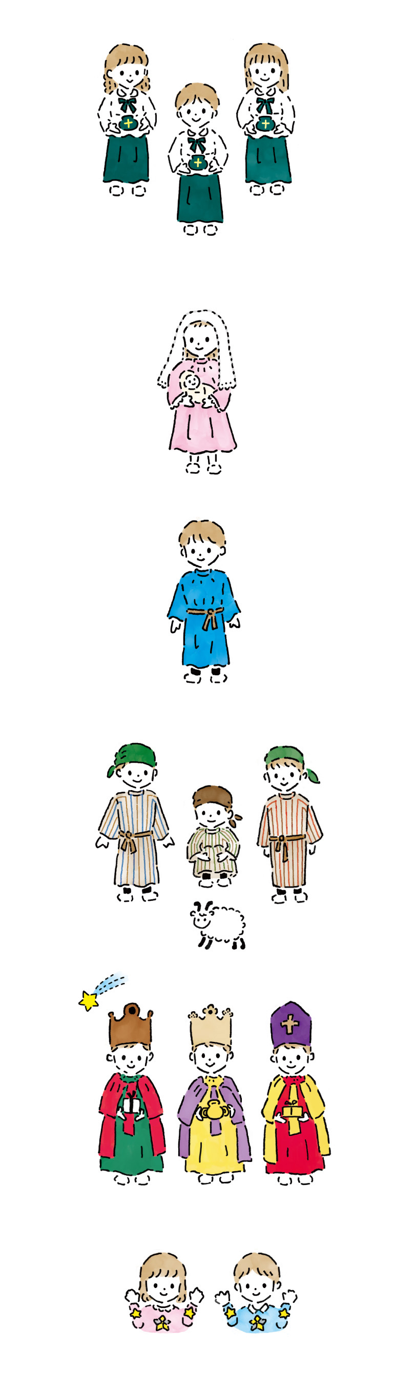 幼稚園文集 聖劇ページ hiroko kimura 企画デザイン OVERVIEW 幼稚園 カラーイラスト YEAR 2021 幼稚園の文集用のイラストです。劇の感動を思い出せるように1人ずつ心を込めて描きました。
