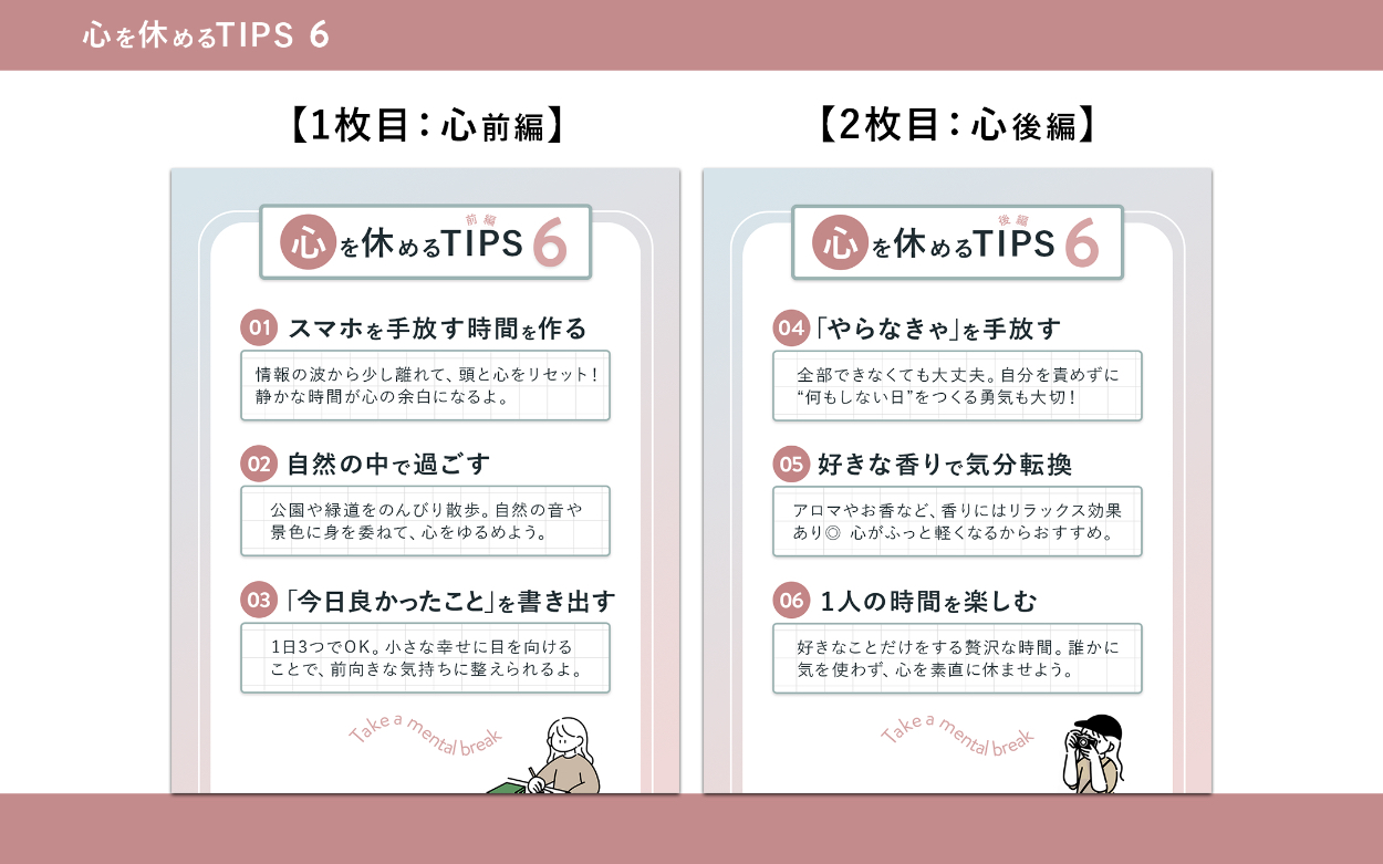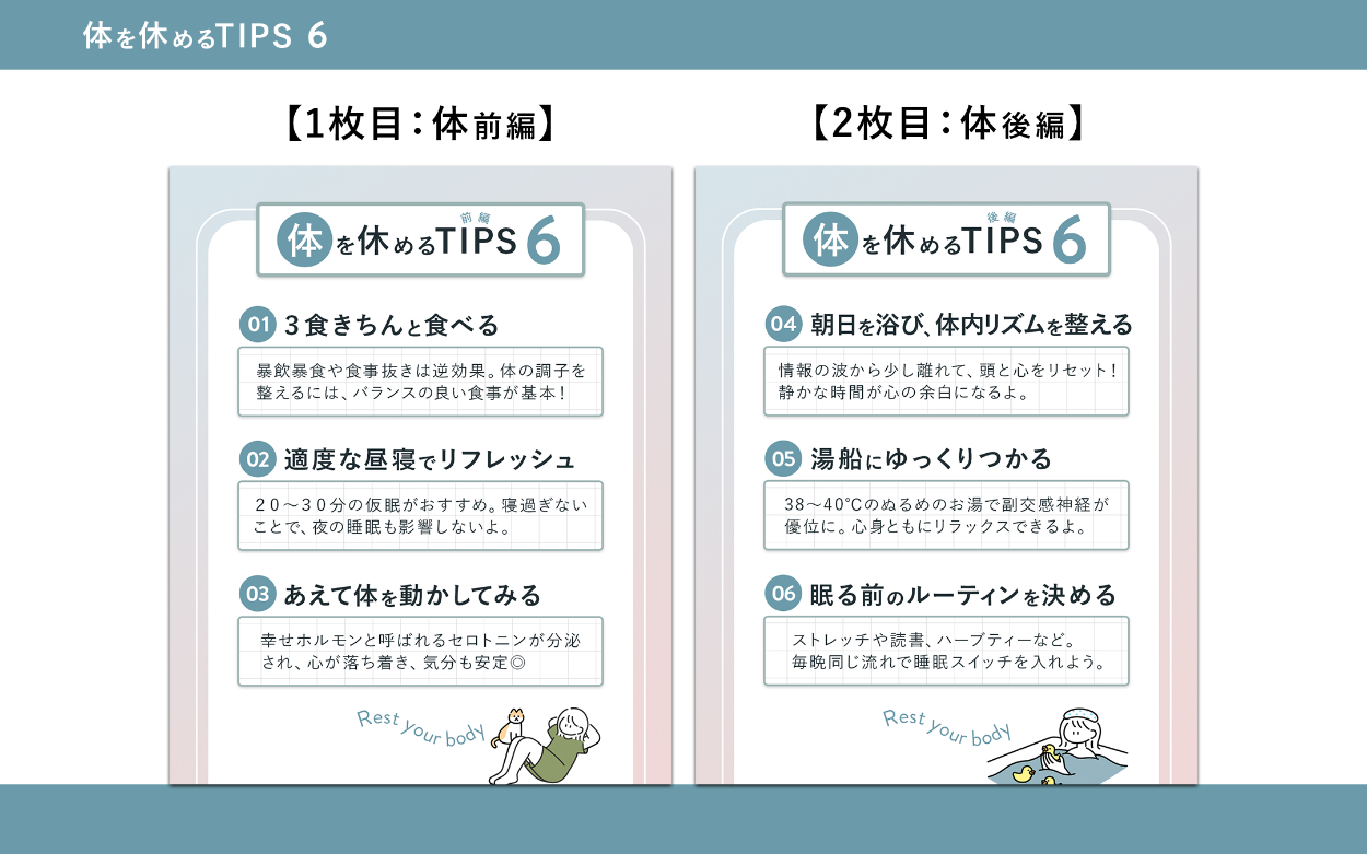項目名+実践のポイントを記載する決まりでしたので、まず項目(TIPS)を強調。続いて実践のポイントを端的にまとめ、パッと読みやすくしました。内容も難しくなく、気軽に実践できるものであることを意識しました。