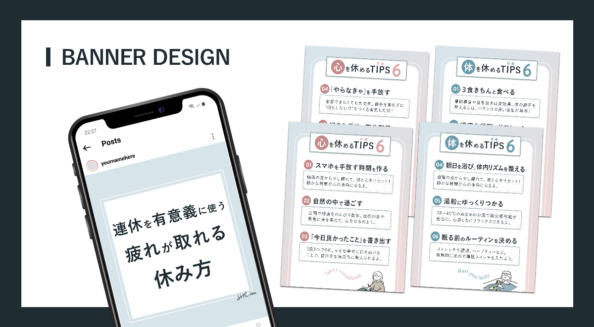 《休み方》がテーマなので心や体をほぐす、リラックスさせるイメージで背景は柔らかいグラデーションにしました。