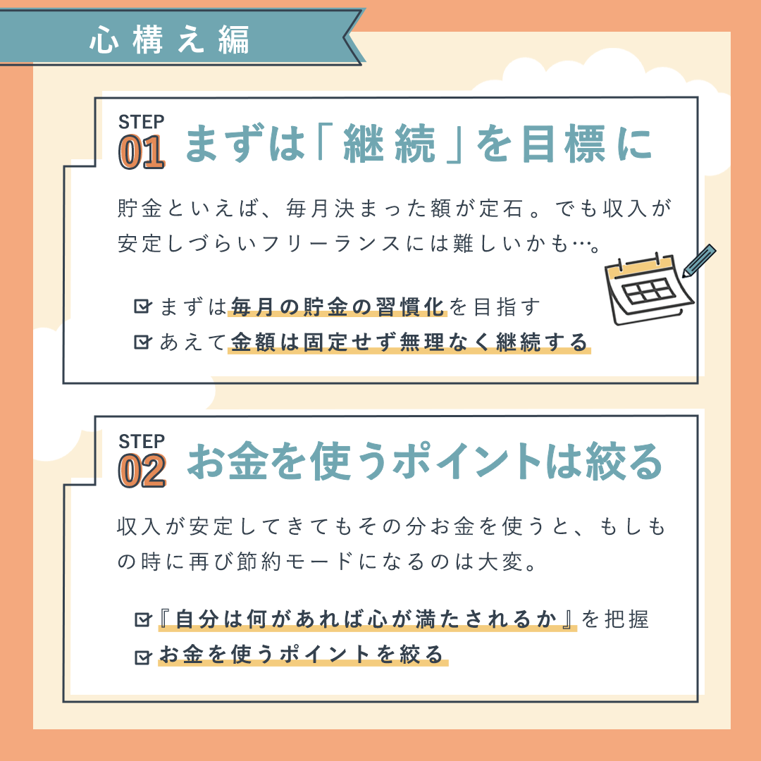 【自主制作】SNS用バナー制作 真琴 Webデザイナー OVERVIEW キャリアスクール『SHElikes』のSNSクリエイティブコンぺに向けて制作したバナー。 YEAR 2023 詳細制作テーマは「フリーランスでも貯金できる?」コンペ開催元より提供された表紙のトンマナに合わせてデザイン。内容はクライアント提供の参考資料と、補足として自身で探した資料を元に制作。個別画像