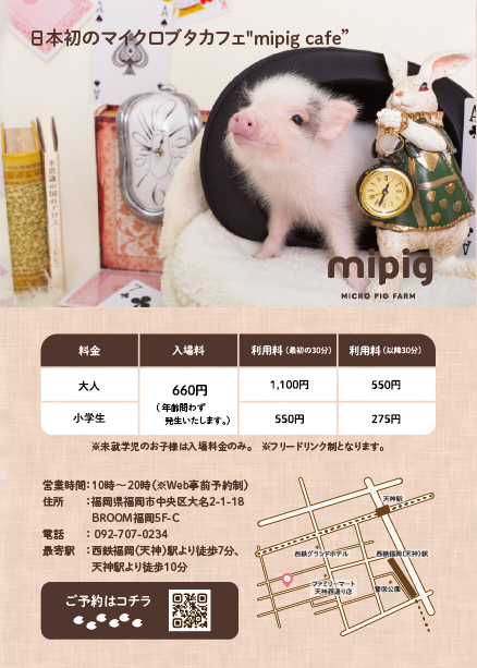 マイクロブタさんと触れ合うことができる「mipig cafe」福岡店様の広告チラシです。