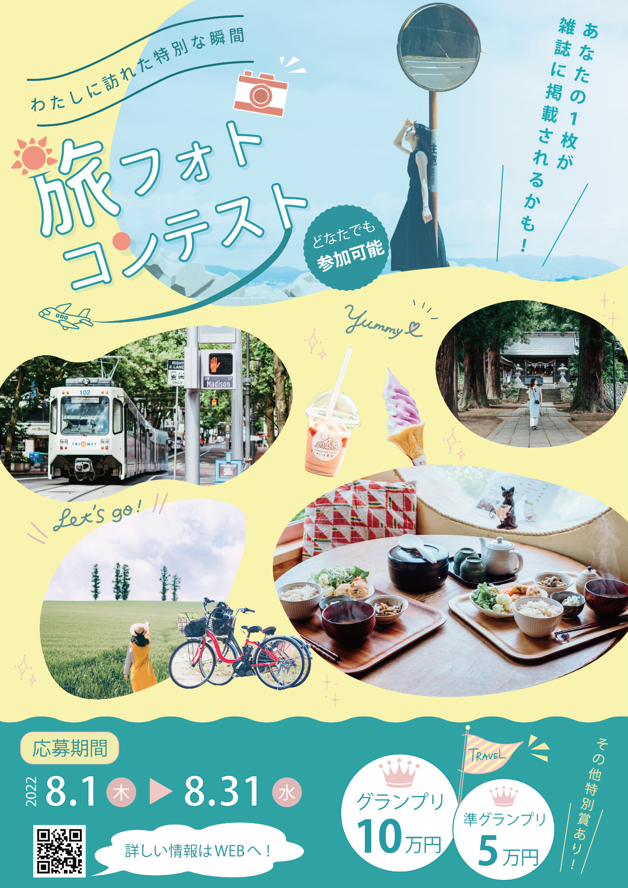 旅フォトコンテストの参加者を募るためのフライヤー制作で、ライフスタイル、食、ファッションなど生活にまつわる様々な内容をピックアップしている雑誌「SHEBOOK」(架空の雑誌)に掲載