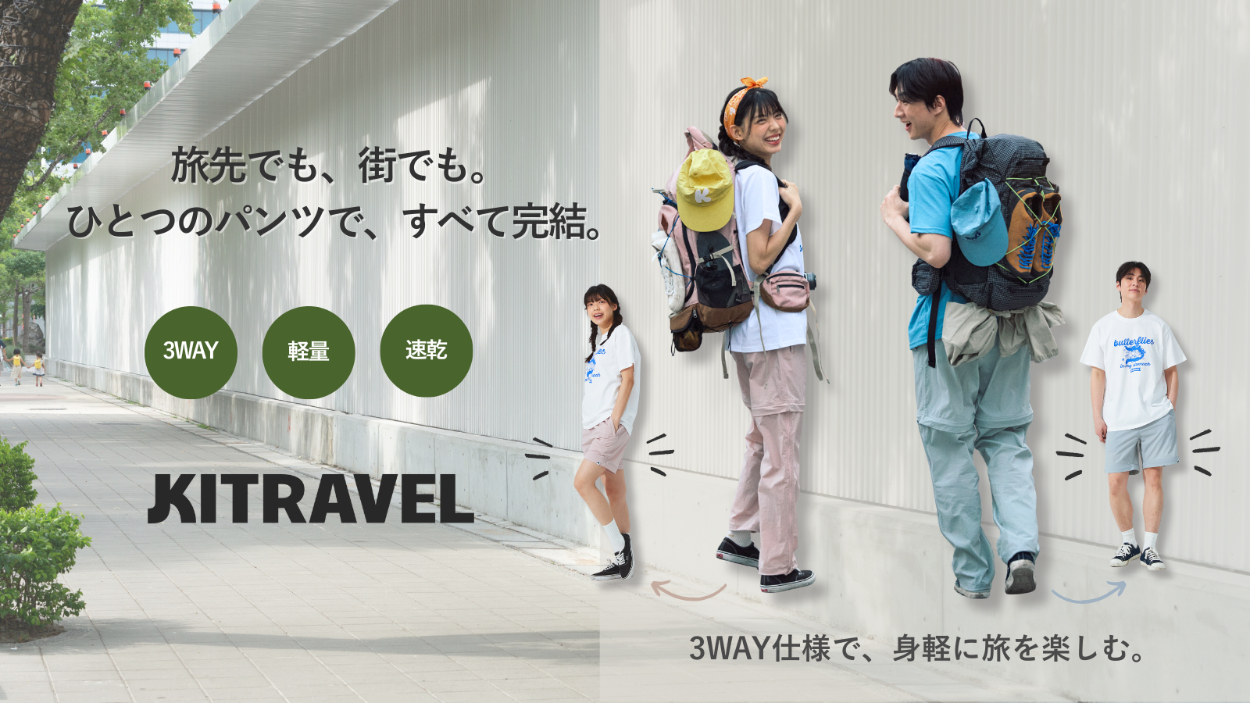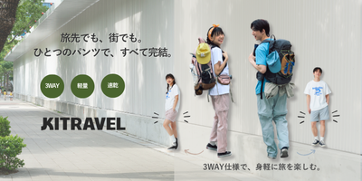 「旅×多機能パンツ」商品の広告用横長バナーデザインです。