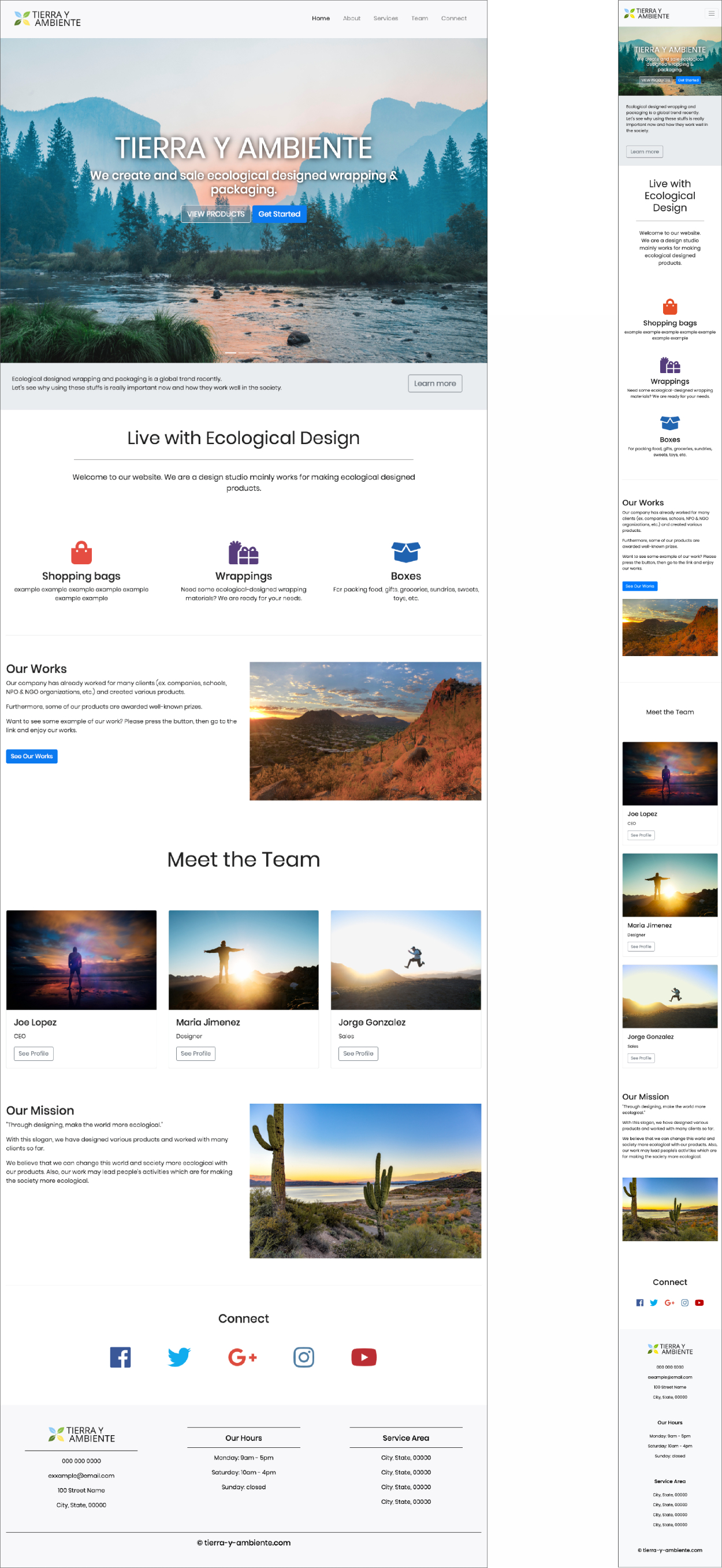 環境に配慮した包装資材やパッケージを販売する架空の会社「TIERRA Y AMBIENTE(ティエラ・イ・アンビエンテ)」のサイト制作を実施。コーディングとサイトのアップロードを行った。使用言語やツールは、HTML5&CSS3/jQuery/Bootstrapなど。
