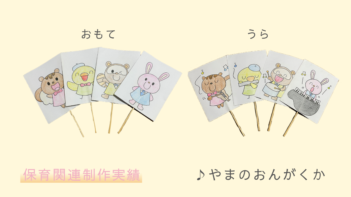 おもて面は歌う姿、うら面は楽器を演奏する姿を描き、場面の切り替えを視覚的にわかりやすく表現。