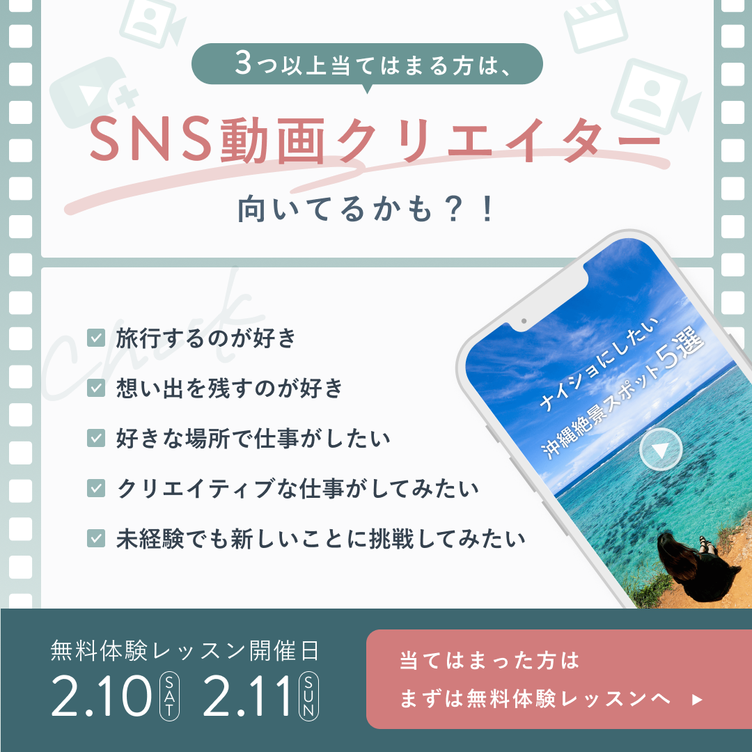 SNS動画クリエイターという内容に合わせて、一目で動画関係の広告だとわかるようにフィルム風のデザインでまとめました。