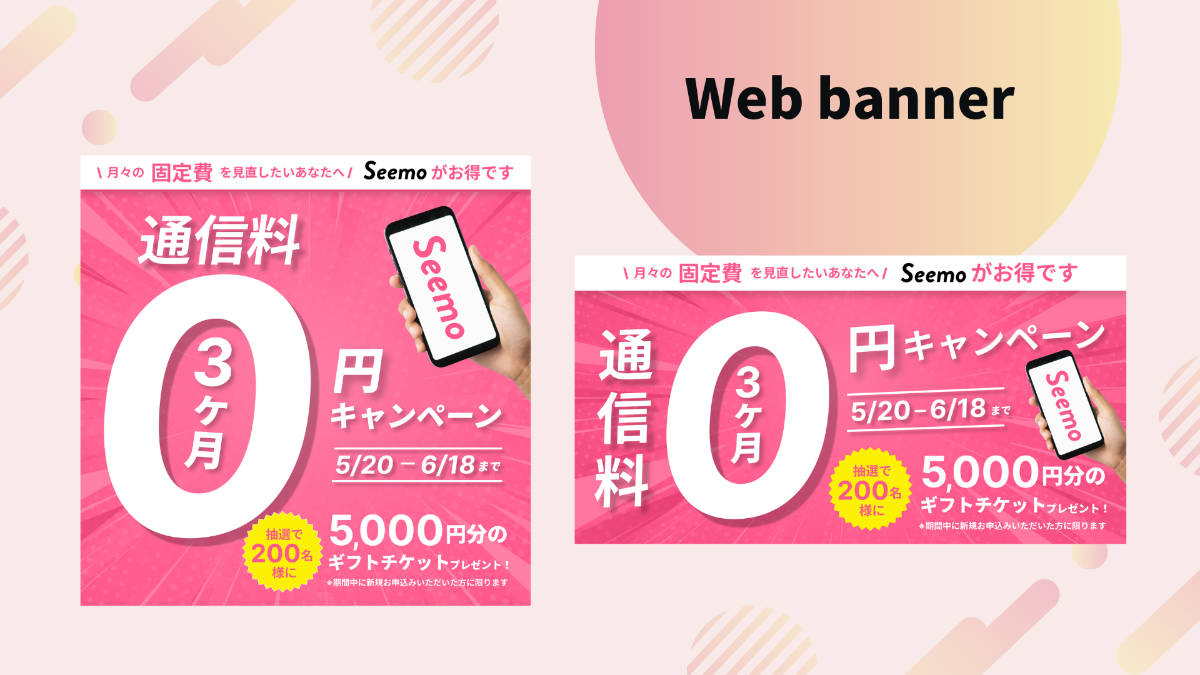 ・背景には放射線状の線+ドット模様を使用し、キャンペーンらしいポップな印象と「0」への視線誘導を両立させました。