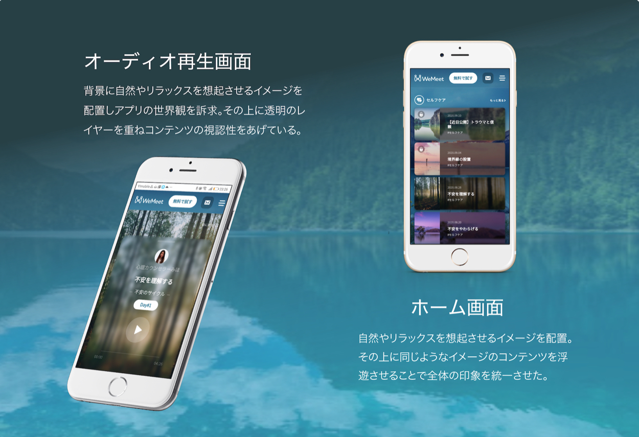 背景に自然やリラックスを想起させるグリーン〜ブルーのイメージを配置しアプリの世界観を訴求。その上に同じようなイメージのコンテンツを浮遊させることでページ全体の印象を統一させた。若年層の女性(ペルソナ設計より抽出)を踏まえ、柔らかめのピンクをピックアップしてUIに落とし込んでいる。緩和させるためのやわらかい印象となる補色や無彩色を採用し、全体的なバランスを調和するデザインを採用した。