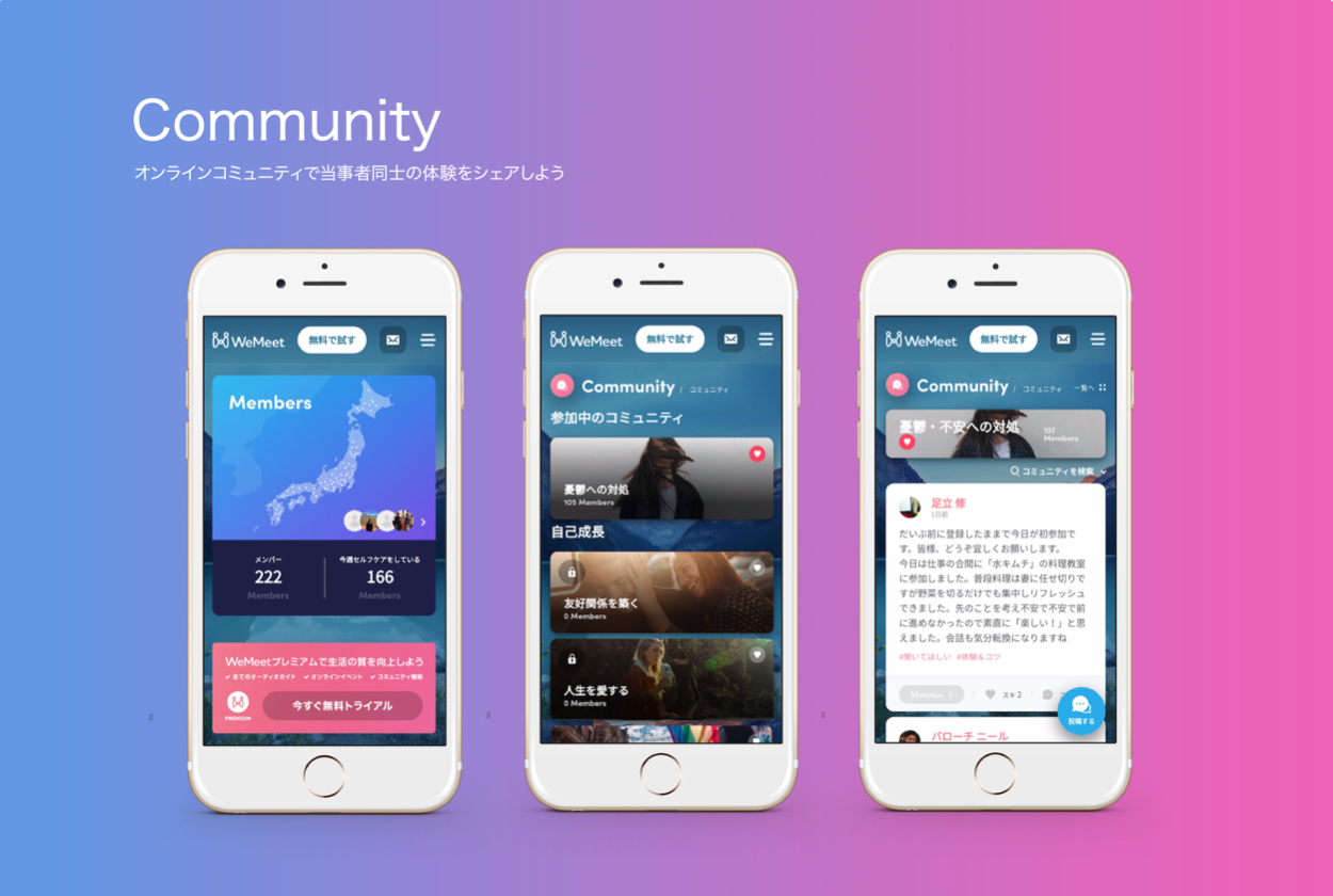 「専門的知識」(=オーディオガイドでの専門家の知識を通じて、より良い人生を歩む)と「体験的知識」(=オンラインコミュニティでの当事者同士の体験のシェアを通じて、より良い人生を歩む)の双方を体験として提供するアプリを目指した。