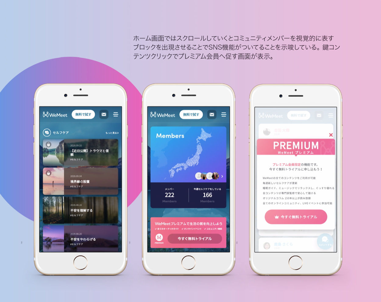 鍵コンテンツクリックでプレミアム会員へ促す画面が表示。スクロールしていくとコミュニティメンバーを視覚的に表すブロックを 出現させる事で、SNS機能がついてることを示唆している。オーディオガイド、コラム、コミュニティ機能など一連のユーザ体験をアプリ1つで実現している。多機能な仕様を複雑に感じさせない構造に設計し、ユーザビリティの高いUIを設計を心がけた。