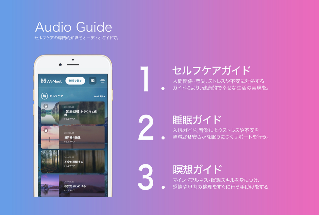 セルフケア専門家にガイドされながら人間関係・ストレス・不安への対処を実現するアプリ。睡眠の質を高める睡眠ガイド、生産性向上や思考の整理に役立つ瞑想ガイドなど数多くの専門家監修コンテンツにより、ウェルビーイングな生活の実現を手伝う。