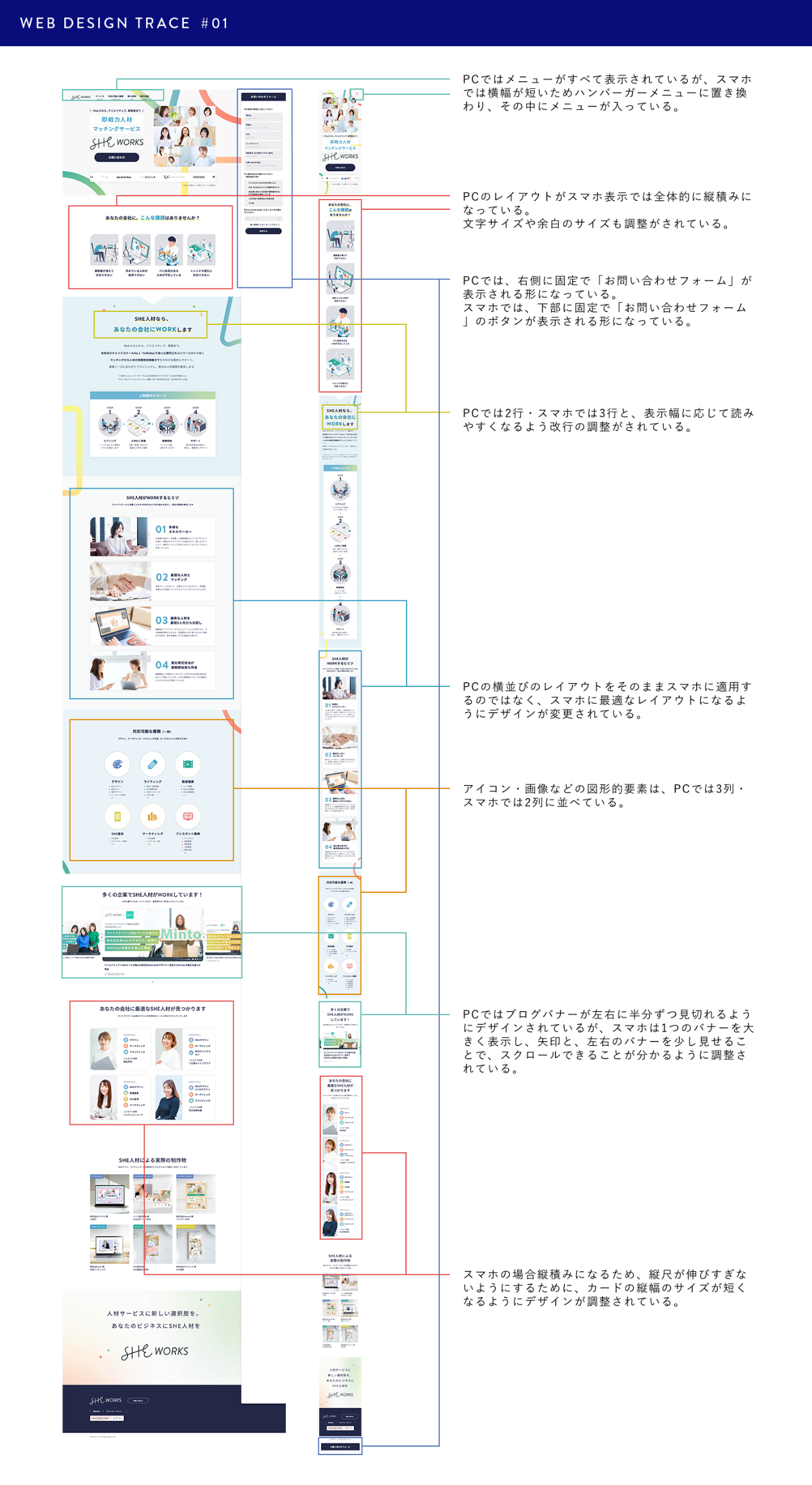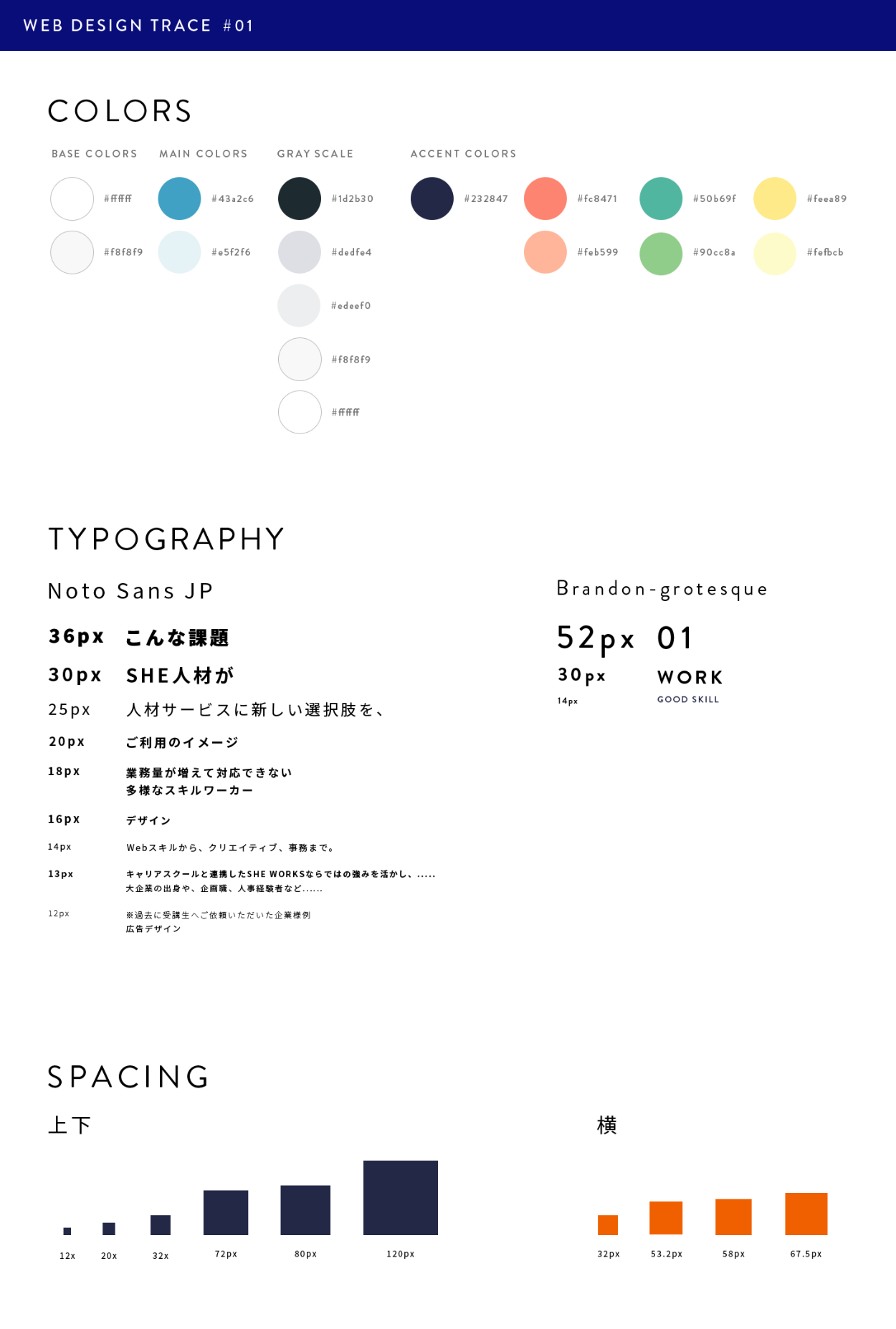webページトレース Fujioka Kaori OVERVIEW webページのトレースとレスポンシブデザインの分析を行いました。 Webサイトにおける読みやすい文字のサイズや、レイアウトの組み方、色の使い方をつかみながら、スタイルガイドにまとめました。
