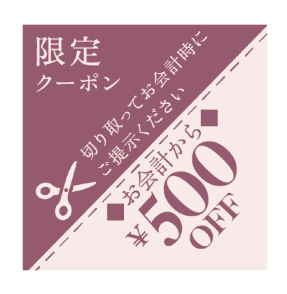 裏面のクーポン部分は全体のデザインには馴染ませつつも、コントラストは強めにし目立つようにしました。また、斜めに切り取り線を入れ、ユーザーが切り取って使用しやすいように工夫しました。