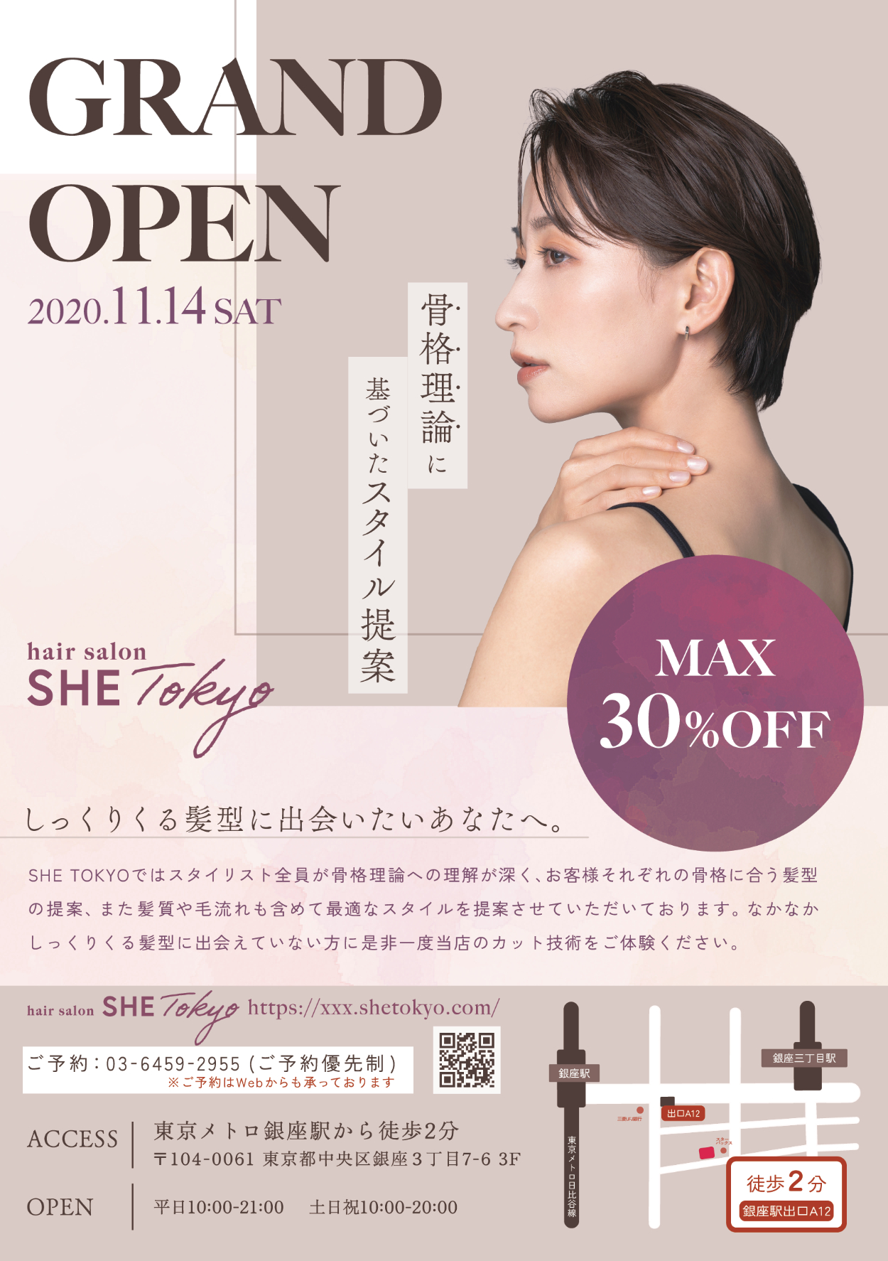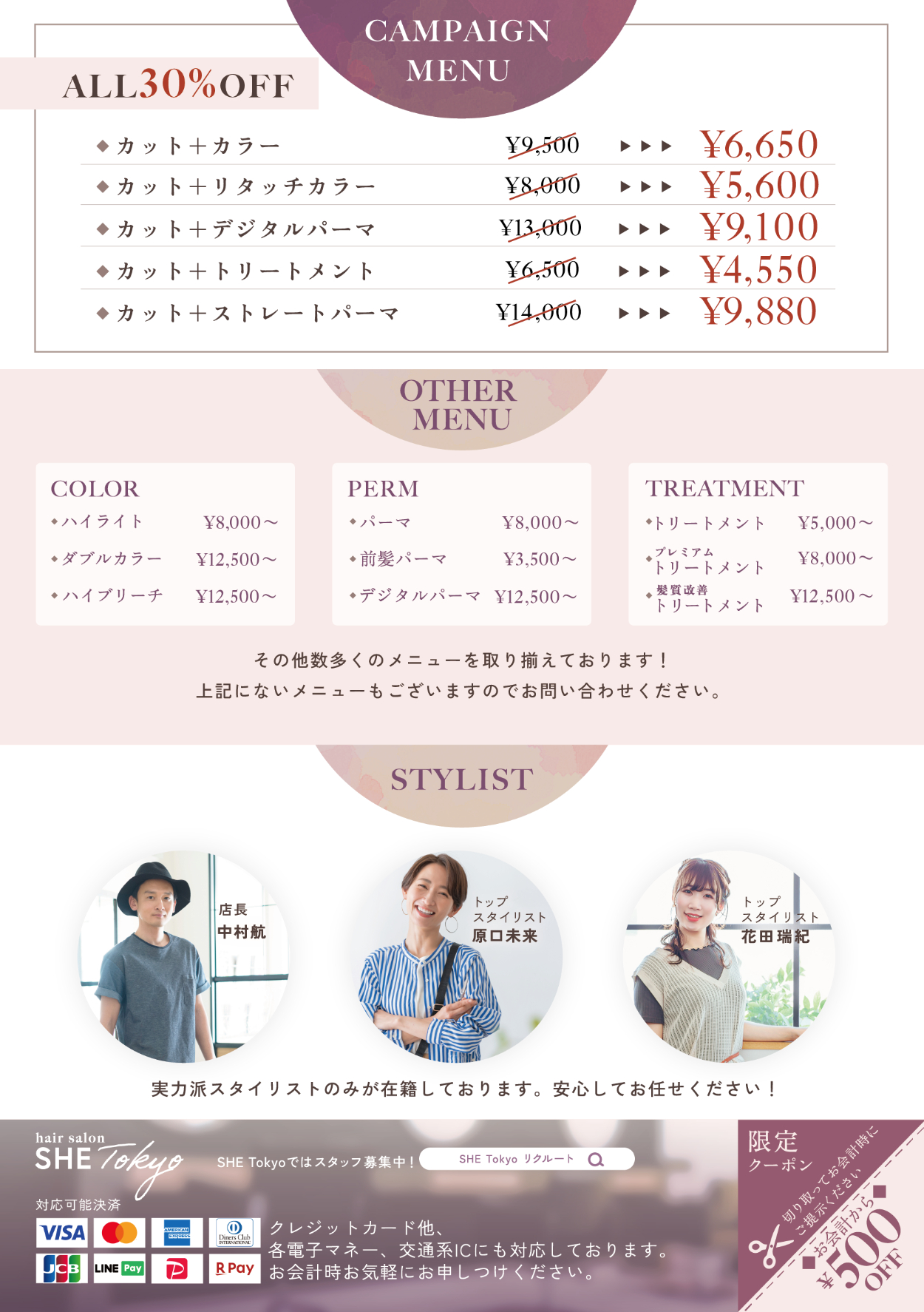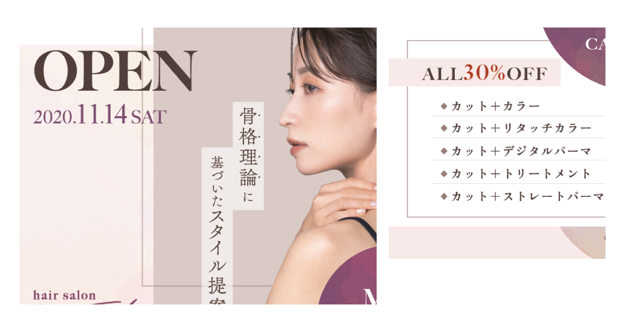 SHE Likesマルチクリエイターコース内にて、美容院(架空)の新規オープン告知・特別キャンペーンフライヤーを制作しました。