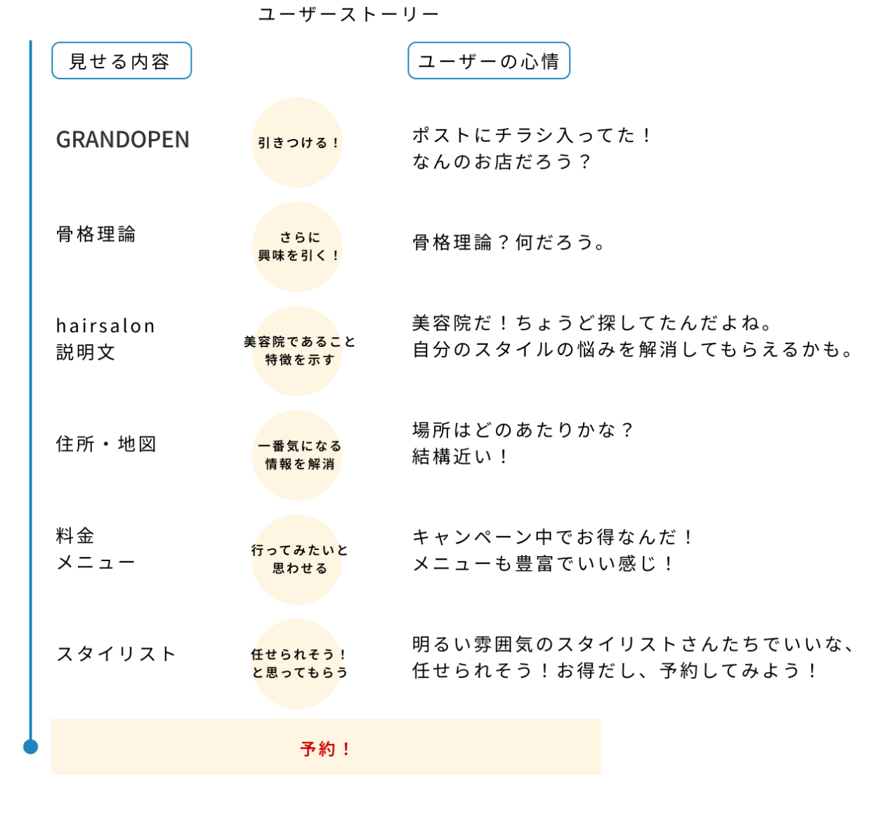 まずはGRAND OPENの文言を大きく見せて興味を引き、ターゲットにここでならヘアスタイルの悩みを解消してもらえそうだと感じてもらい、具体的な場所や料金、スタイリスト写真を示すことで来店前の気になる部分を解消、最終的な目的である予約に誘導するという流れです。