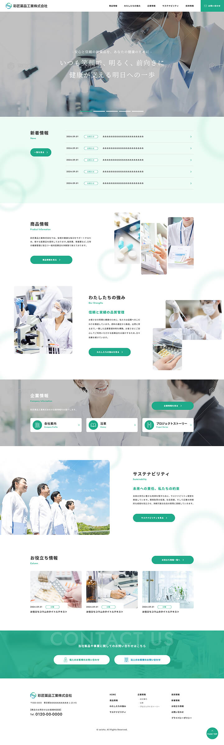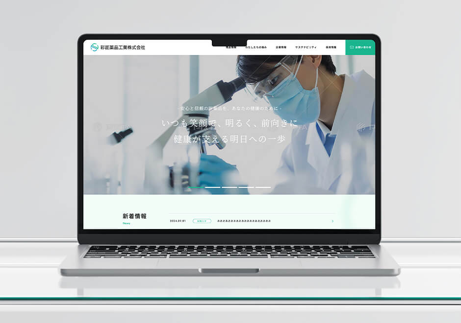 薬品会社デザインサンプル 彩匠デザイン フリーランスWEBデザイナー OVERVIEW デザインは、グリーンをベースに、信頼感や清潔感を感じられるイメージに仕上げました。 レイアウトは各コンテンツの見やすさを重視し、全体的にあまり固いイメージにならないようエッジに丸みを出して柔らかくしております。 YEAR 2024