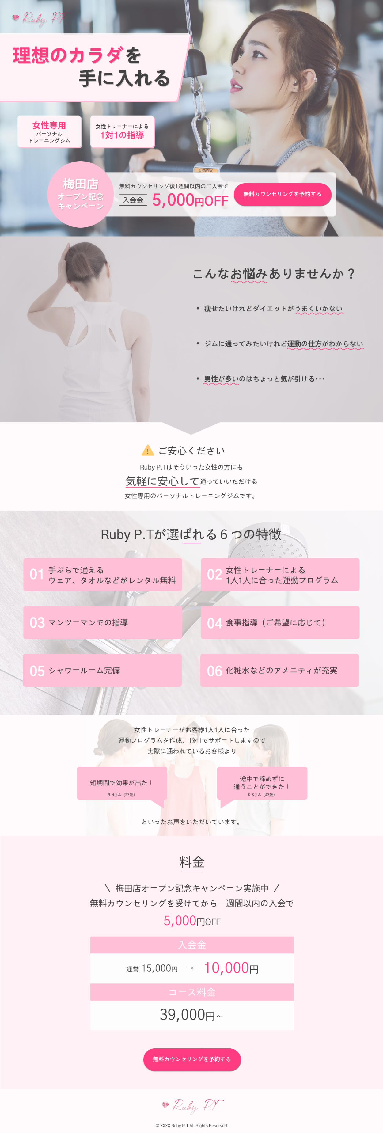 ジム初心者の女性が安心して問い合わせしやすい構成・デザインを目指しました。