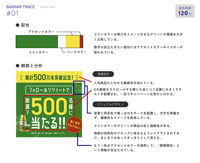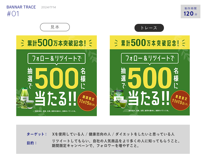 バナートレース Fujioka Kaori OVERVIEW SNSのバナーを制限時間を決めてトレースし分析を行いました。 Photoshopのスキルと論理的なバナー制作を学びました。 【ターゲット】健康志向の人ダイエットをしたいと思っている人【目的】Xでリツイートしてもらい、自社の人気商品をより多くの人に知ってもらうこと。期間限定キャンペーンで、フォロワーを増やすこと。
