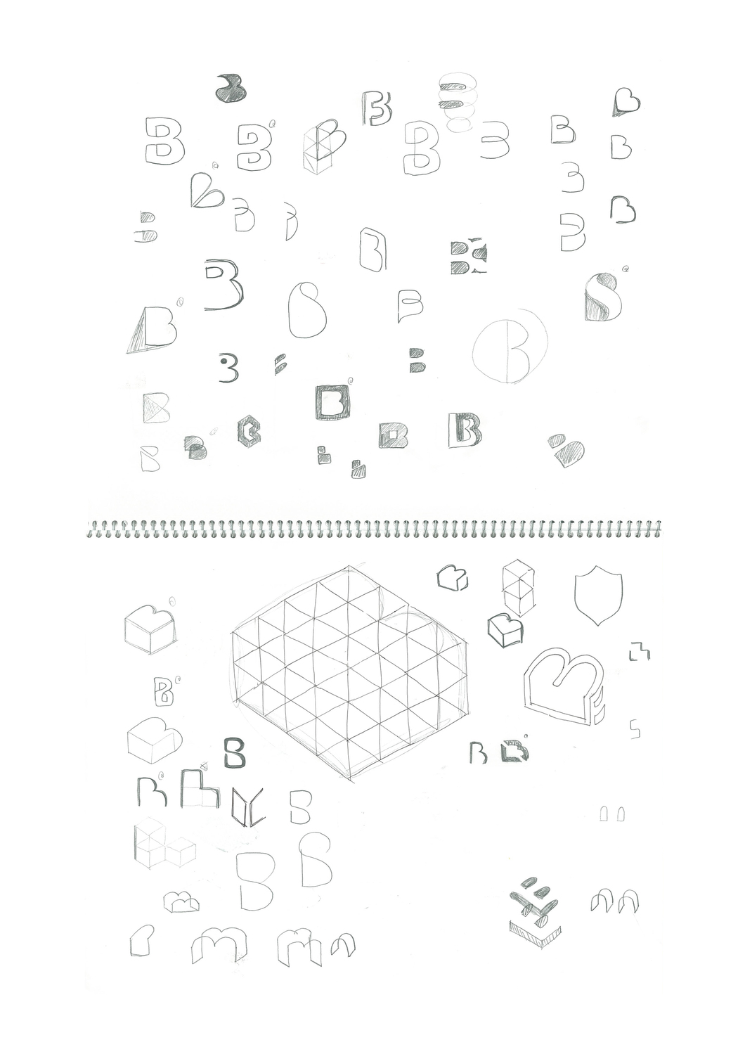という創業時の目標を、ラフスケッチを経てブロックのモチーフに落とし込みました。