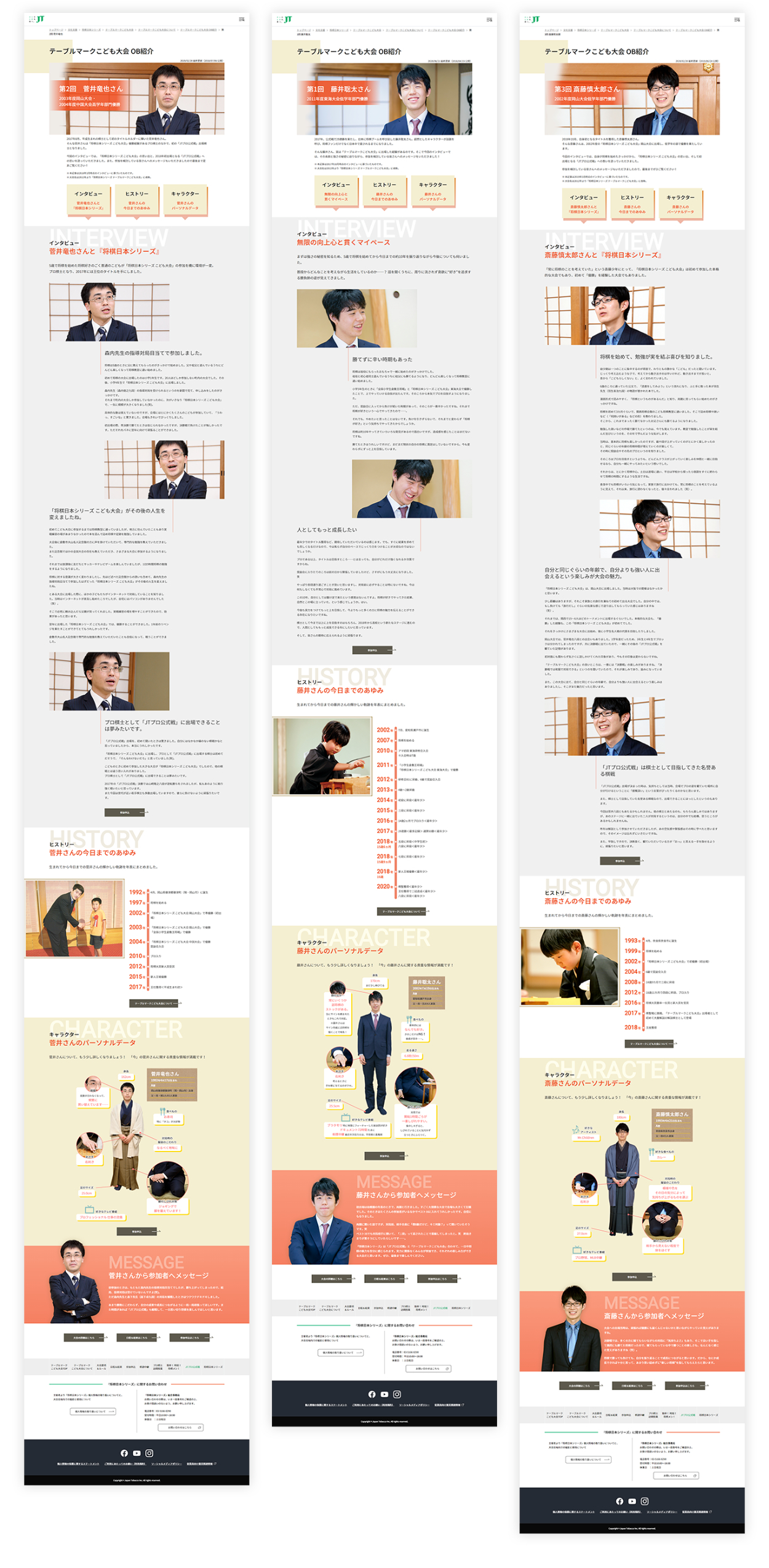 テーブルマークこども大会 OB紹介とその下層ページ Shiori Ono Webデザイナー OVERVIEW OB紹介のTOPとその下層の、3棋士のページをデザインしました。 [担当:デザイン] YEAR 2020 WEBSITE